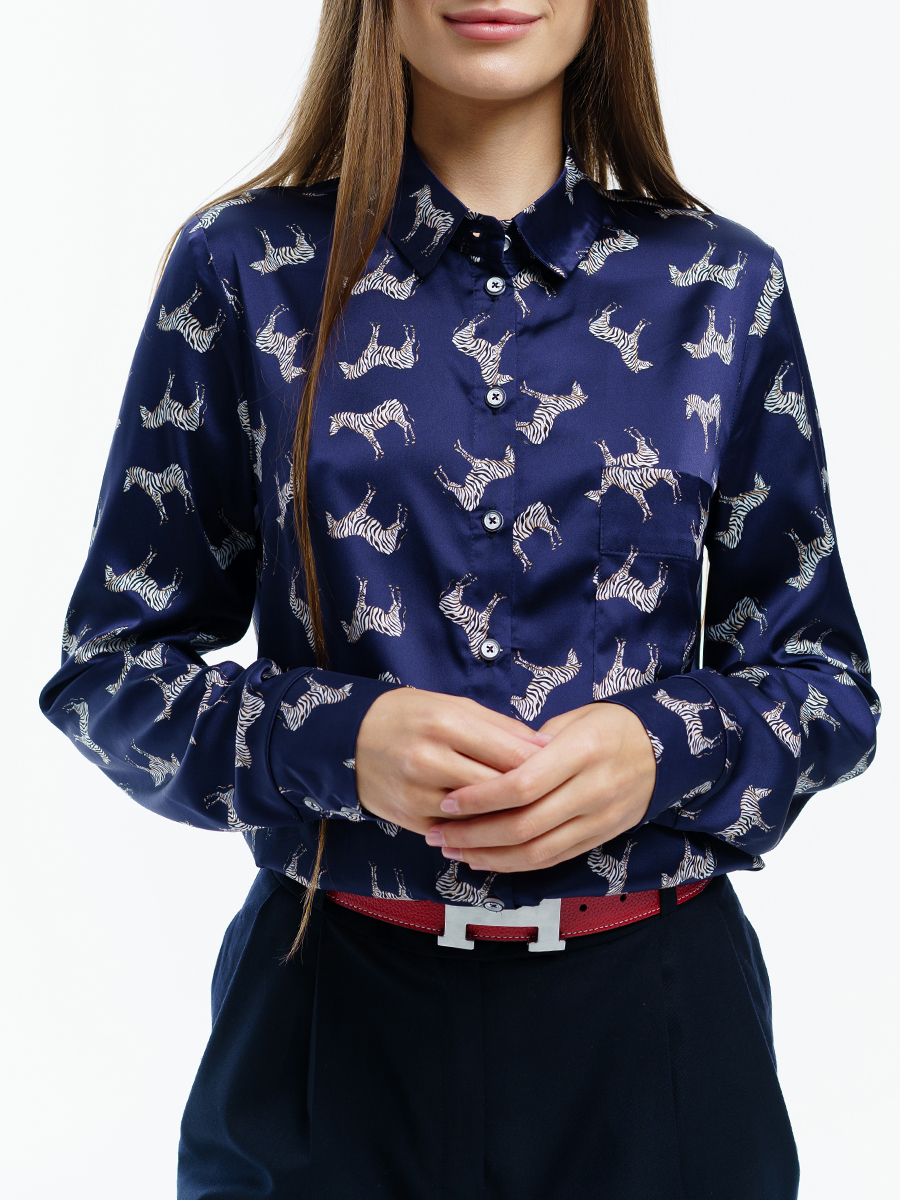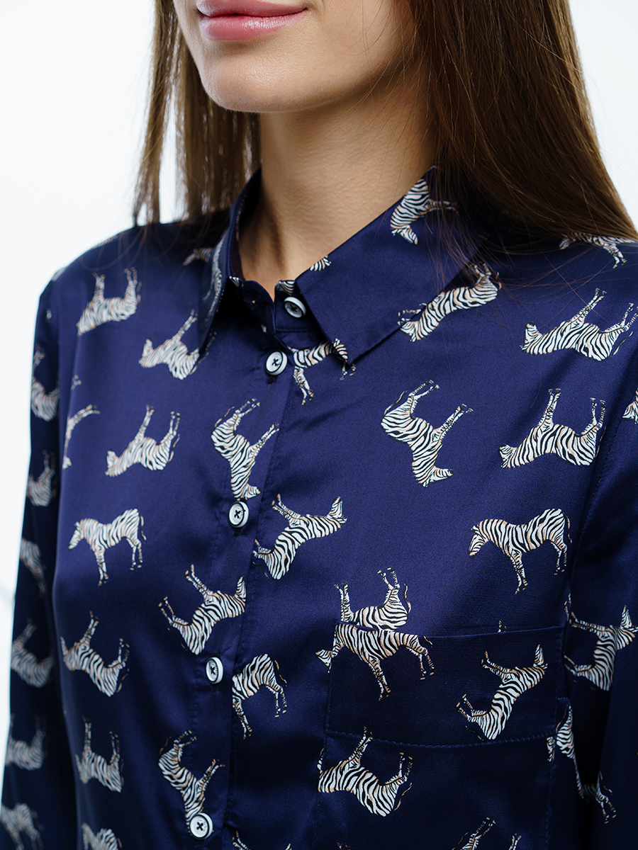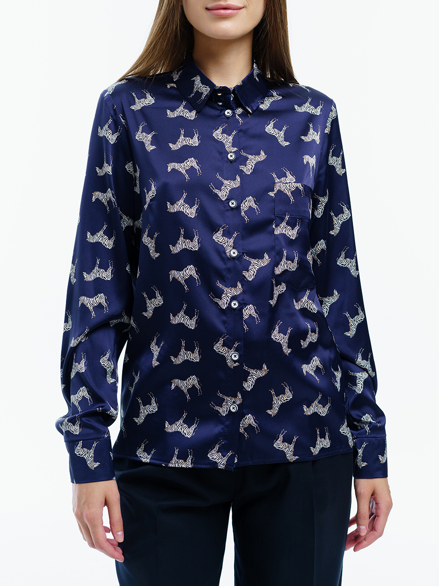 Одна из самых необходимых вещей в любом гардеробе – классическая блузка. Manika Belle представляет вашему вниманию стильную блузку. Она свободного кроя, классического синего цвета с принтом зебры, отложным воротничком, большим нагрудным карманом. Рукава с манжетами застегиваются на две пуговицы. Такая прекрасная рубашка дополнит ваш повседневный гардероб. Ее легко сочетать с любой одеждой, или в дуэте с брюками 403/04/3 или брюками 402/06/2 от Manika Belle. Эта классическая блуза уместна в любой обстановке: в офисе, на отдыхе, в повседневных делах.