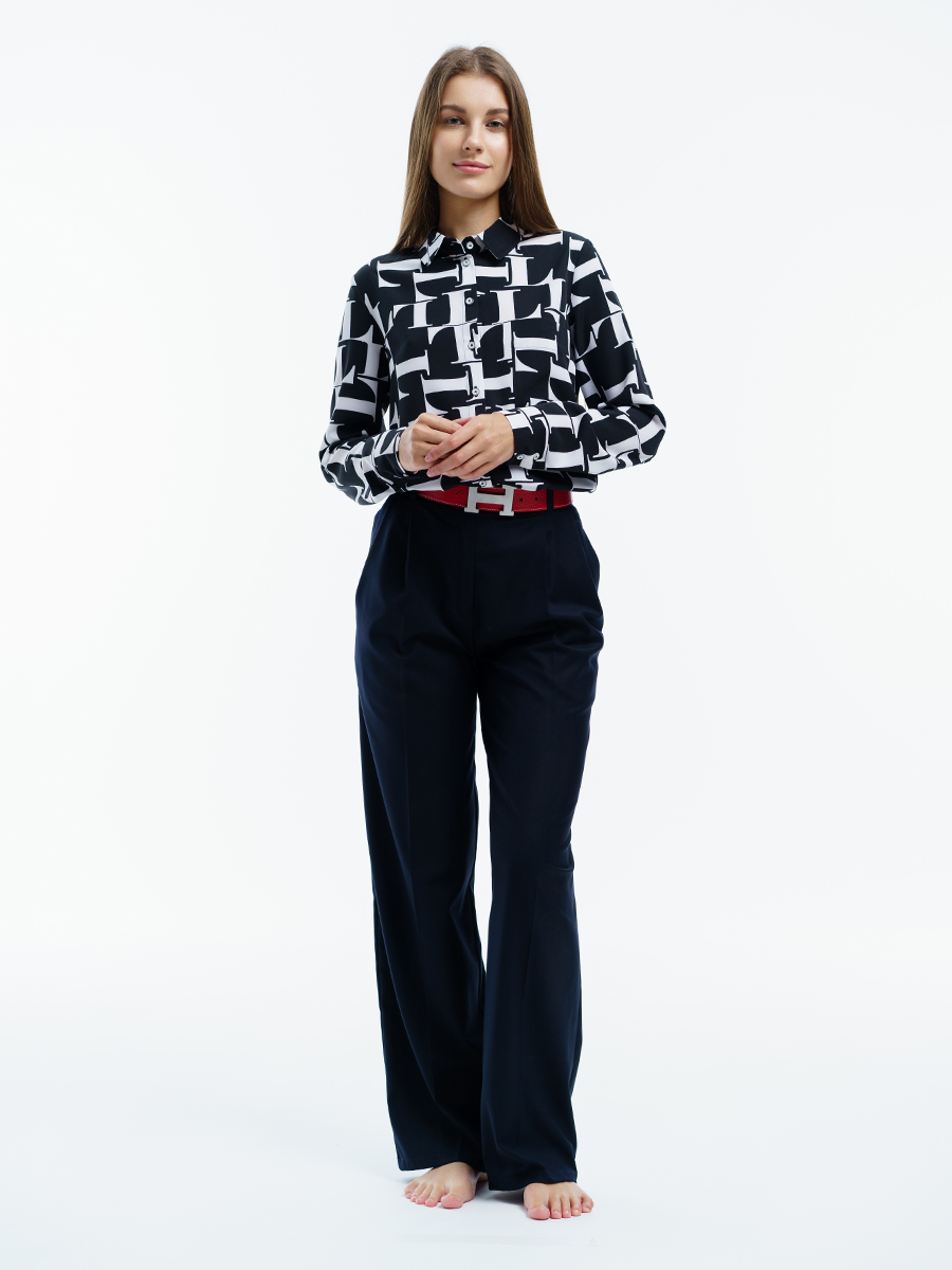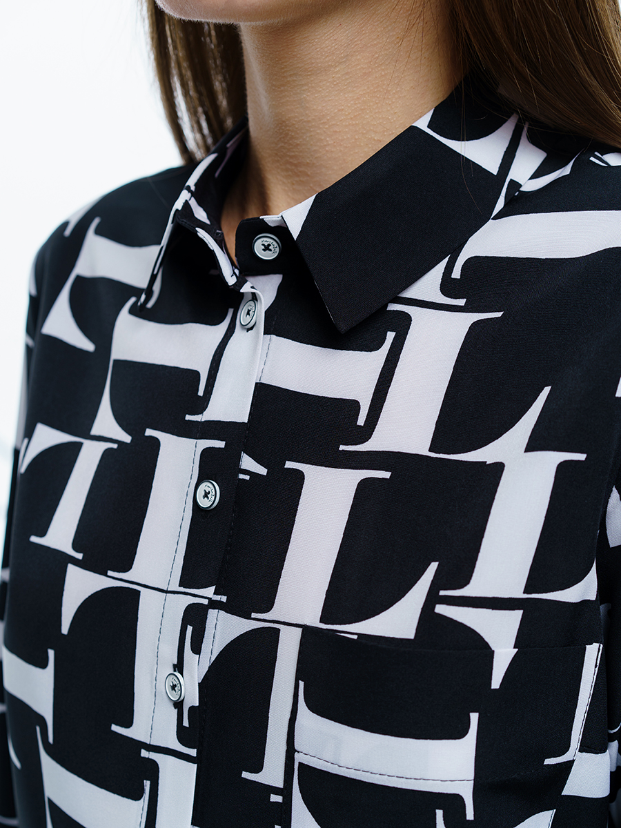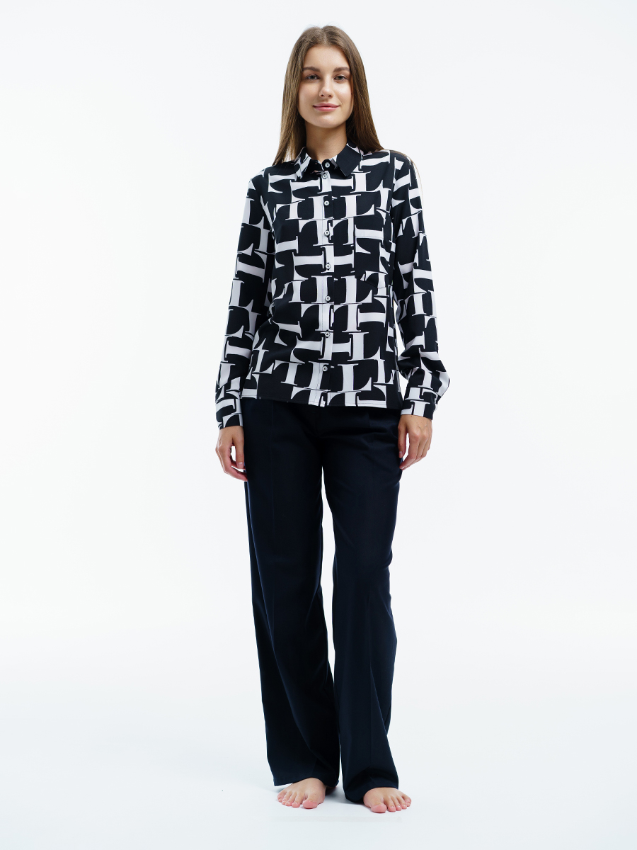 Одна из самых необходимых вещей в любом гардеробе – классическая блузка. Manika Belle представляет вашему вниманию стильную блузку. Она свободного кроя, классического черного цвета с принтом, с отложным воротничком, большим нагрудным карманом. Рукава с манжетами застегиваются на две пуговицы. Такая прекрасная рубашка дополнит ваш повседневный гардероб. Ее легко сочетать с любой одеждой, или в дуэте с брюками 403/04/3 или брюками 402/06/2 от Manika Belle. Эта классическая блуза уместна в любой обстановке: в офисе, на отдыхе, в повседневных делах.