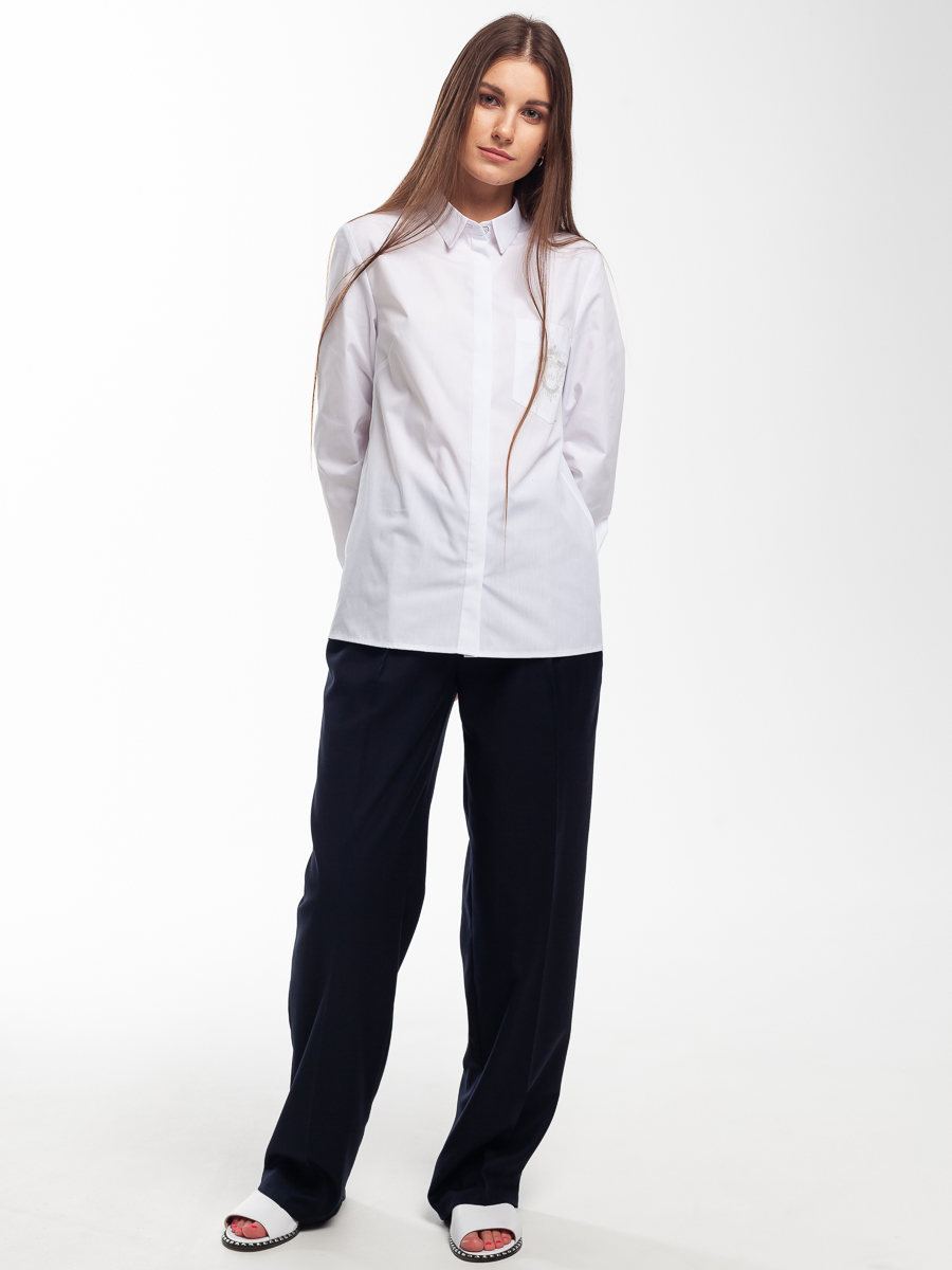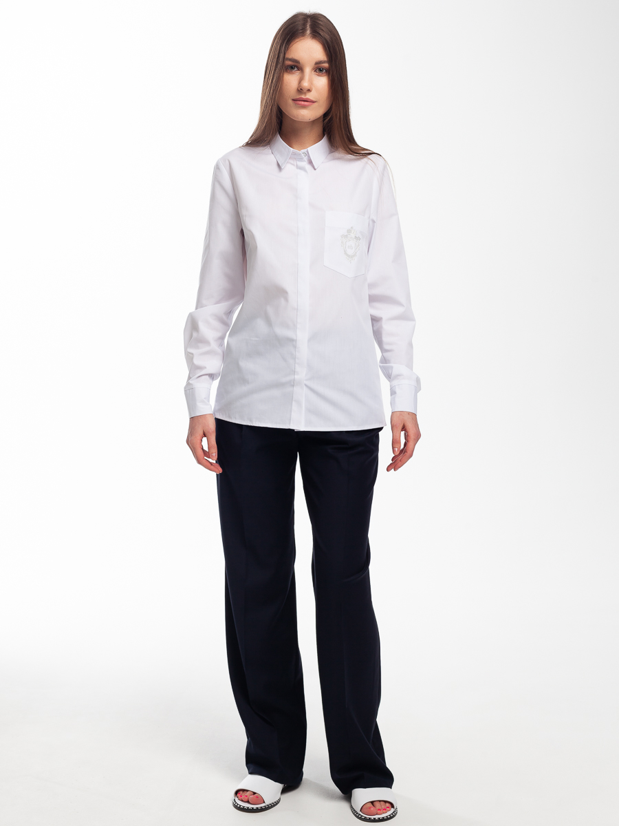 Одна из самых необходимых вещей в любом гардеробе – классическая белая блузка. Manika Belle представляет вашему вниманию блузку из хлопка. Она свободного кроя, классического белого цвета, с отложным воротничком, большим нагрудным карманом и оригинальной вышивкой. Спинка с кокеткой и декоративной складкой, рукава с манжетами застегиваются на две пуговицы. Оригинальная деталь данной модели передняя застежка – супат. Такая прекрасная рубашка дополнит ваш повседневный гардероб. Ее легко сочетать с любой одеждой, или в дуэте с шортами 481/02/1 или брюками 408/01/1 от Manika Belle. Эта классическая блуза уместна в любой обстановке: в офисе, на отдыхе, в повседневных делах.