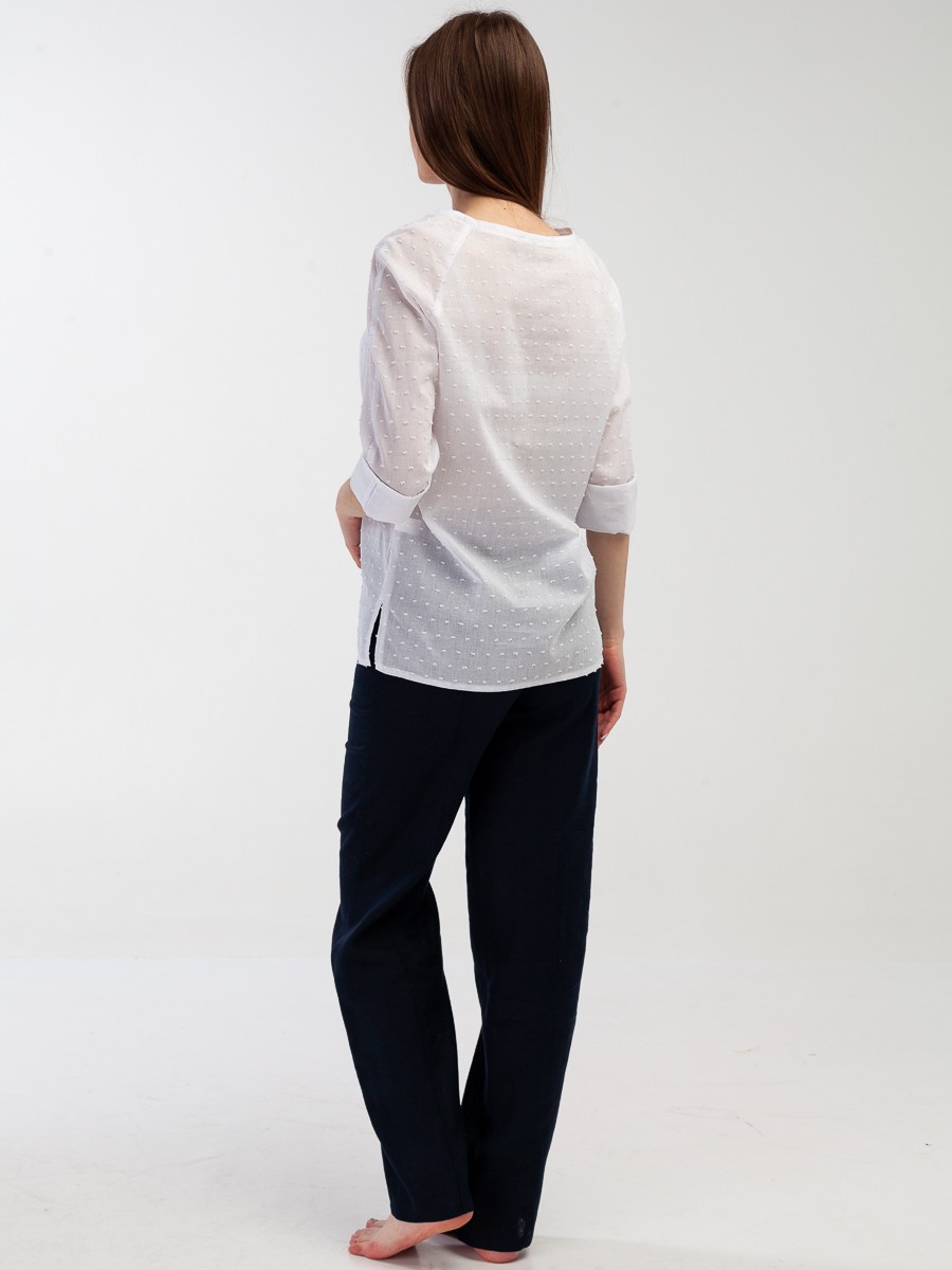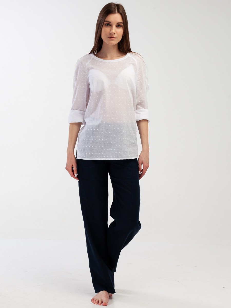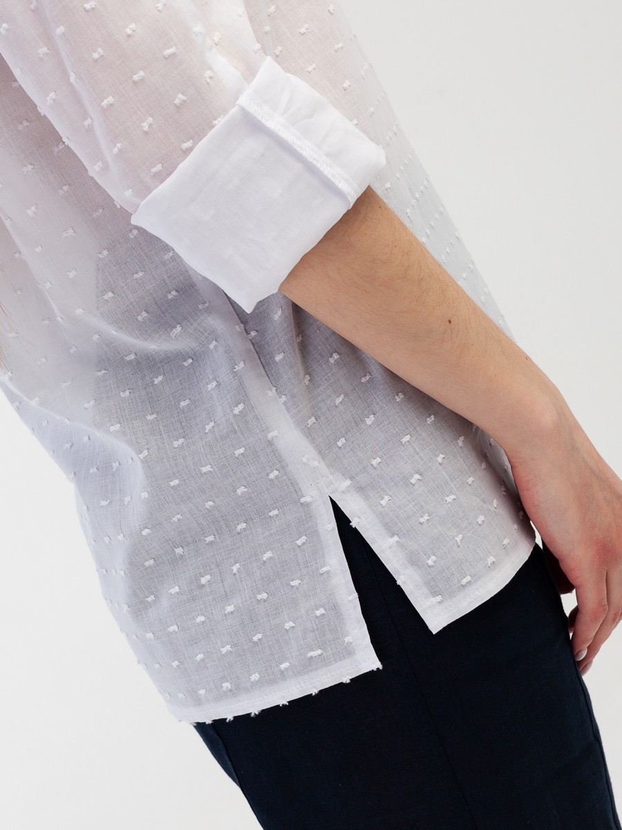 Блузка свободного силуэта с длинным рукавом. Мягкая и приятная на ощупь фактура ткани, состоящая из 100% хлопка. Рукава можно заложить в манжеты. Классический белый цвет с принтом абстракция. Горловина – лодочка. Сзади и спереди декоративная отстрочка. Идеально подходит для жаркого лета. По боковым швам – разрезы 3 см.