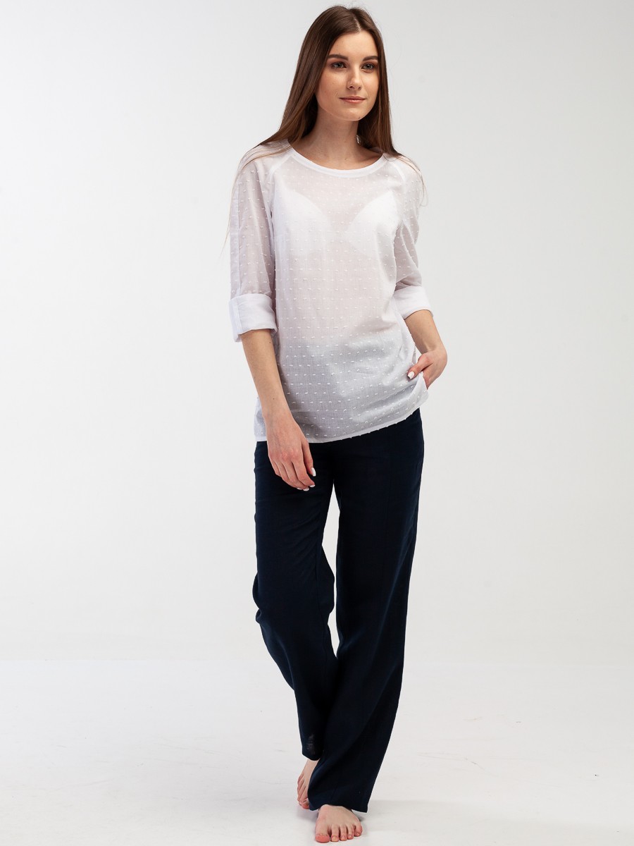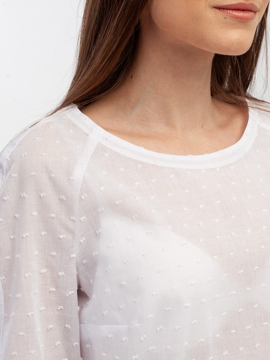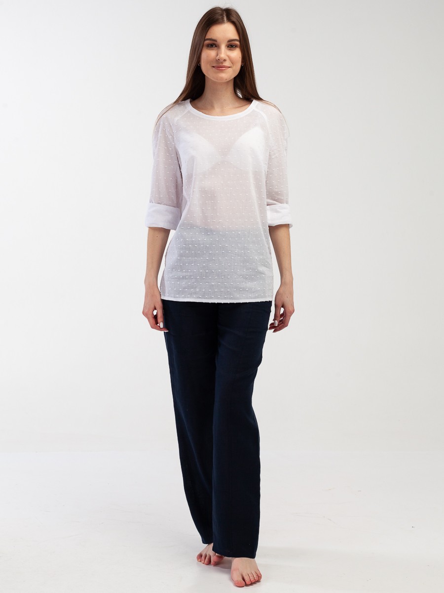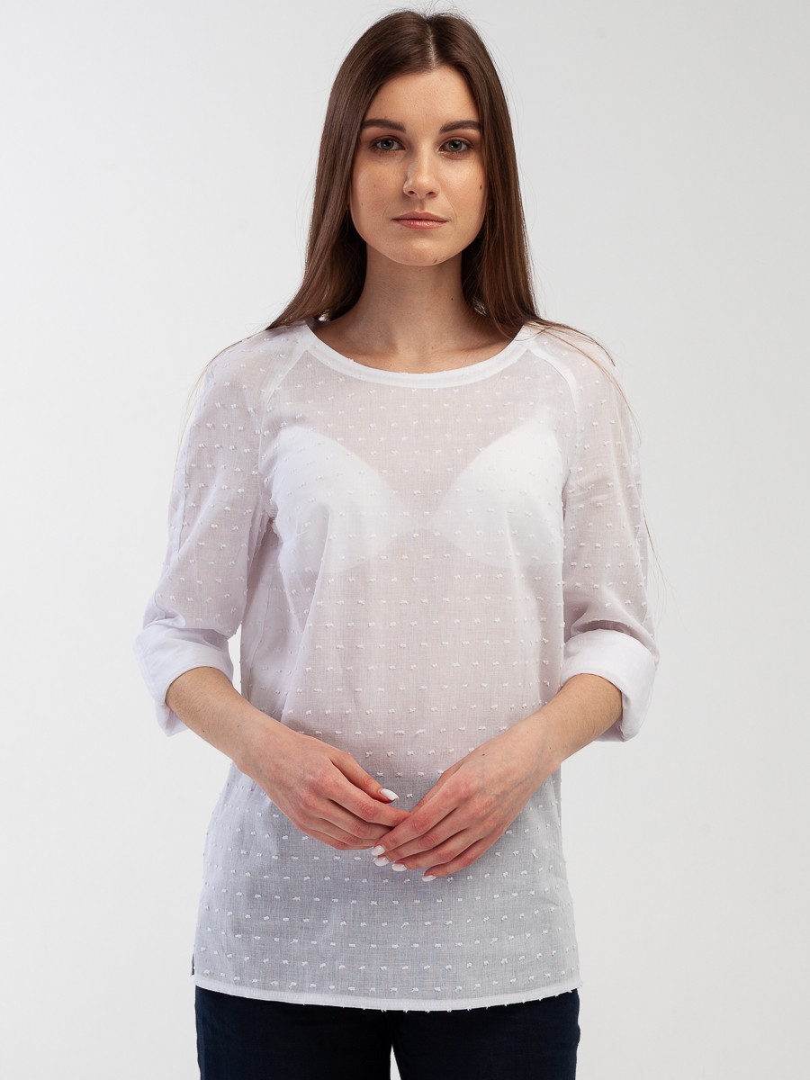 Блузка свободного силуэта с длинным рукавом. Мягкая и приятная на ощупь фактура ткани, состоящая из 100% хлопка. Рукава можно заложить в манжеты. Классический белый цвет с принтом абстракция. Горловина – лодочка. Сзади и спереди декоративная отстрочка. Идеально подходит для жаркого лета. По боковым швам – разрезы 3 см.