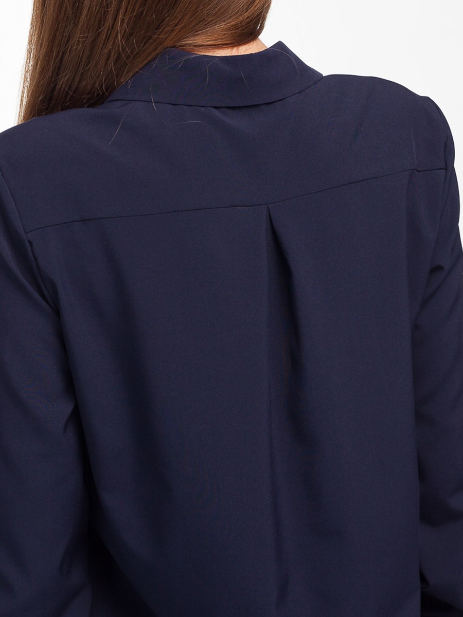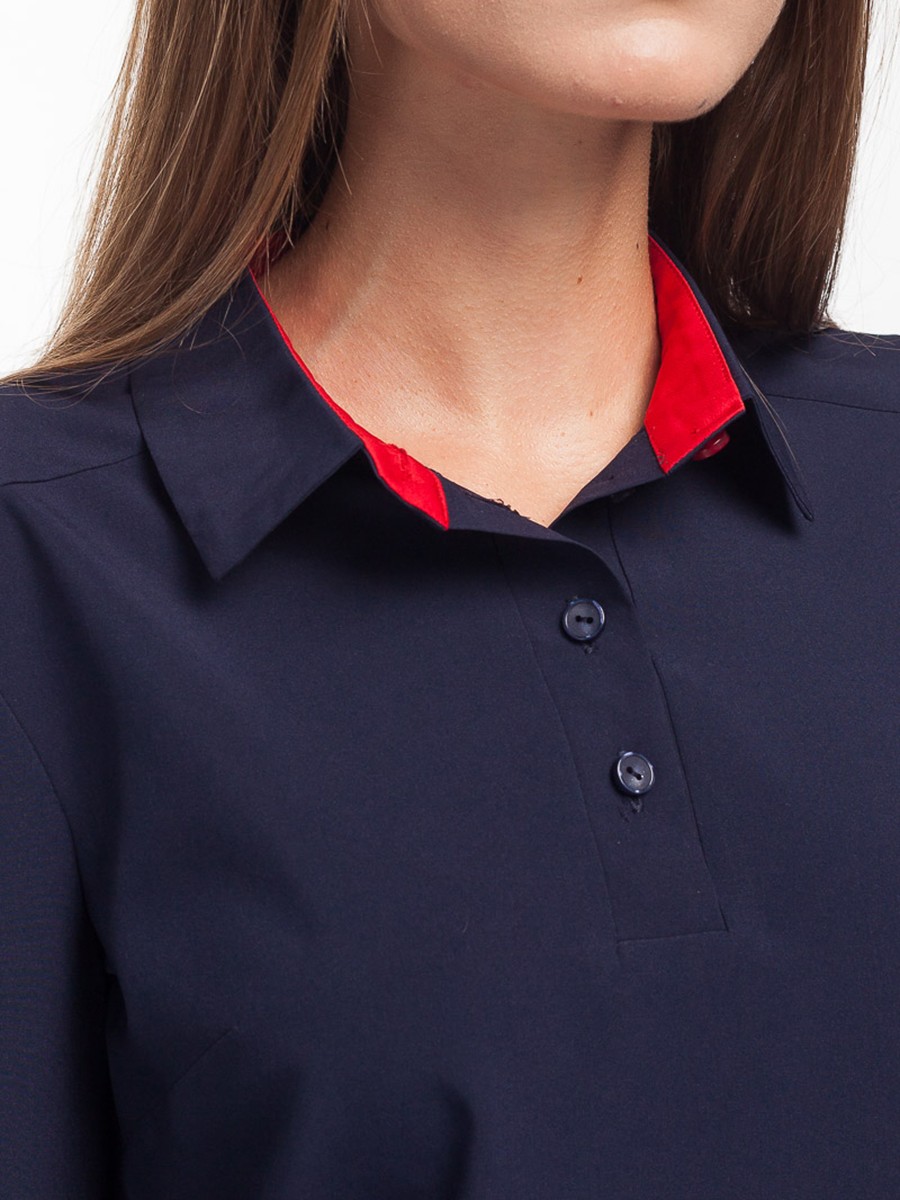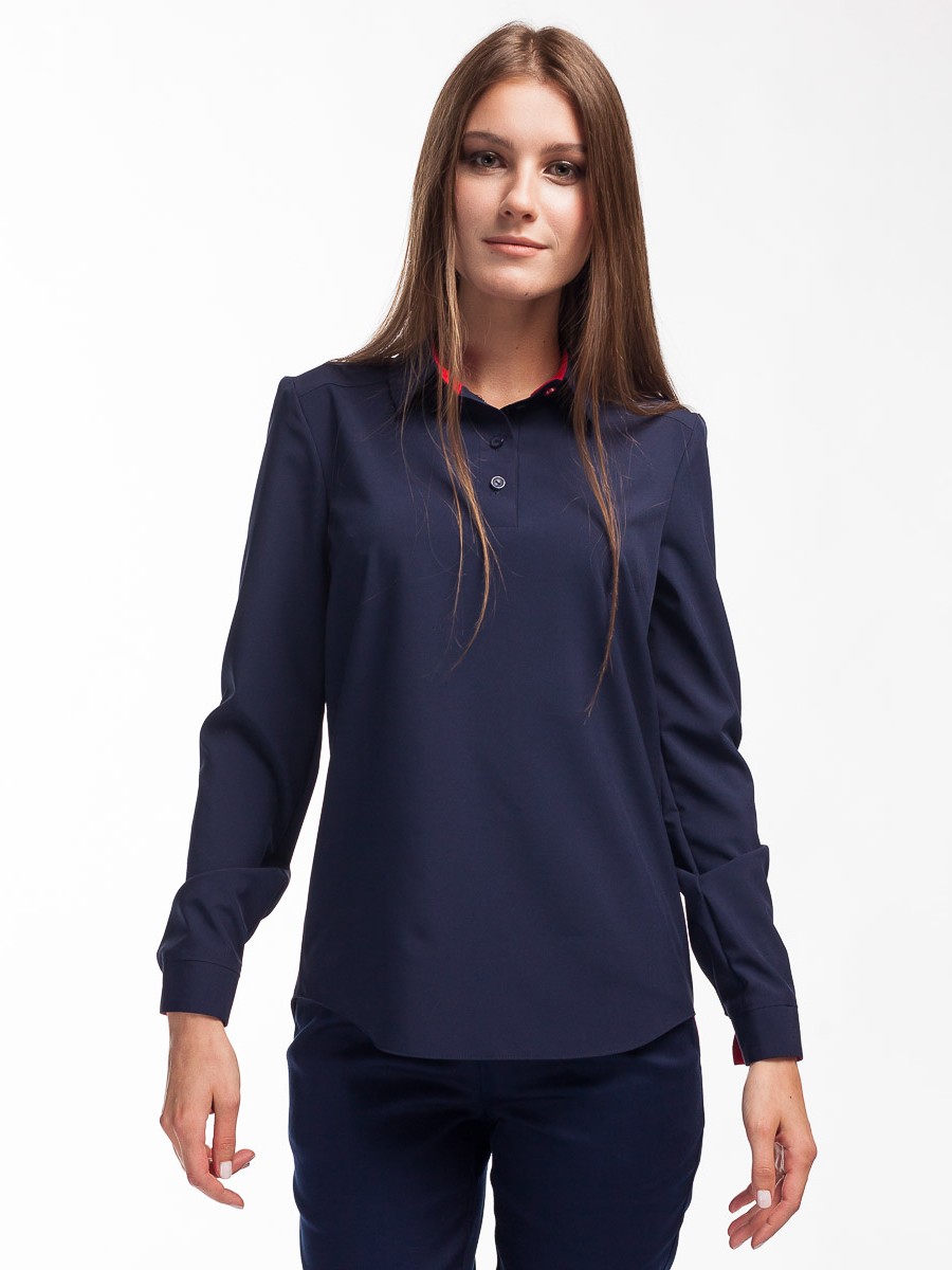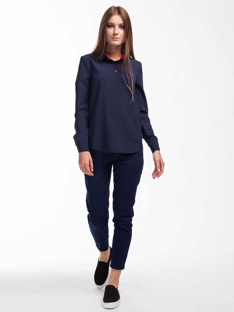 Каждая модница имеет в своем гардеробе хотя бы одну блузку. Блузка необходимая деталь, которая в тоже время и проста, и модна, и многофункциональна. Представляем блузку свободного силуэта с длинным рукавом, стильной красной манжетой и воротником. Мягкая и приятная на ощупь фактура ткани. Глубокий темно синий цвет ткани. Воротничок с четырьмя пуговицами на передней части. Сзади кокетка со встречной складкой. Низ блузки – плавная волна.