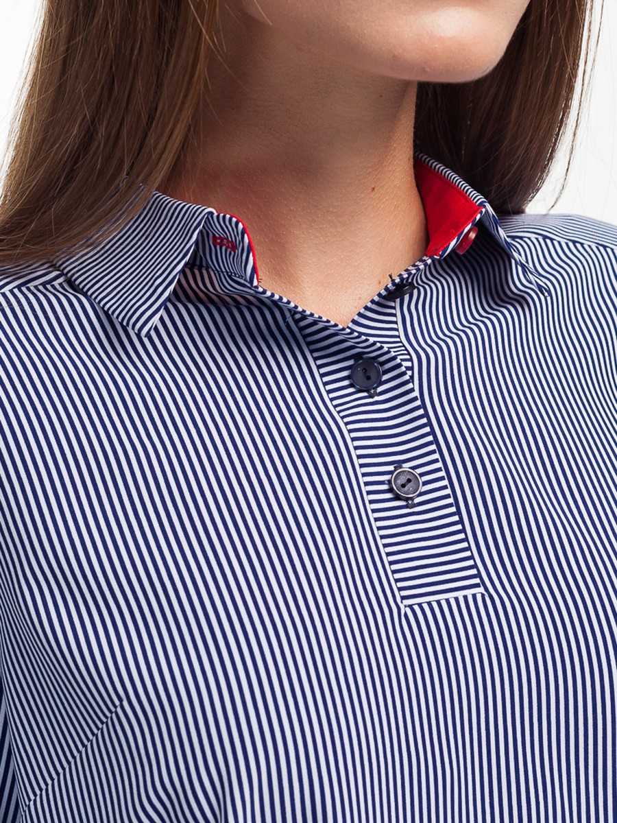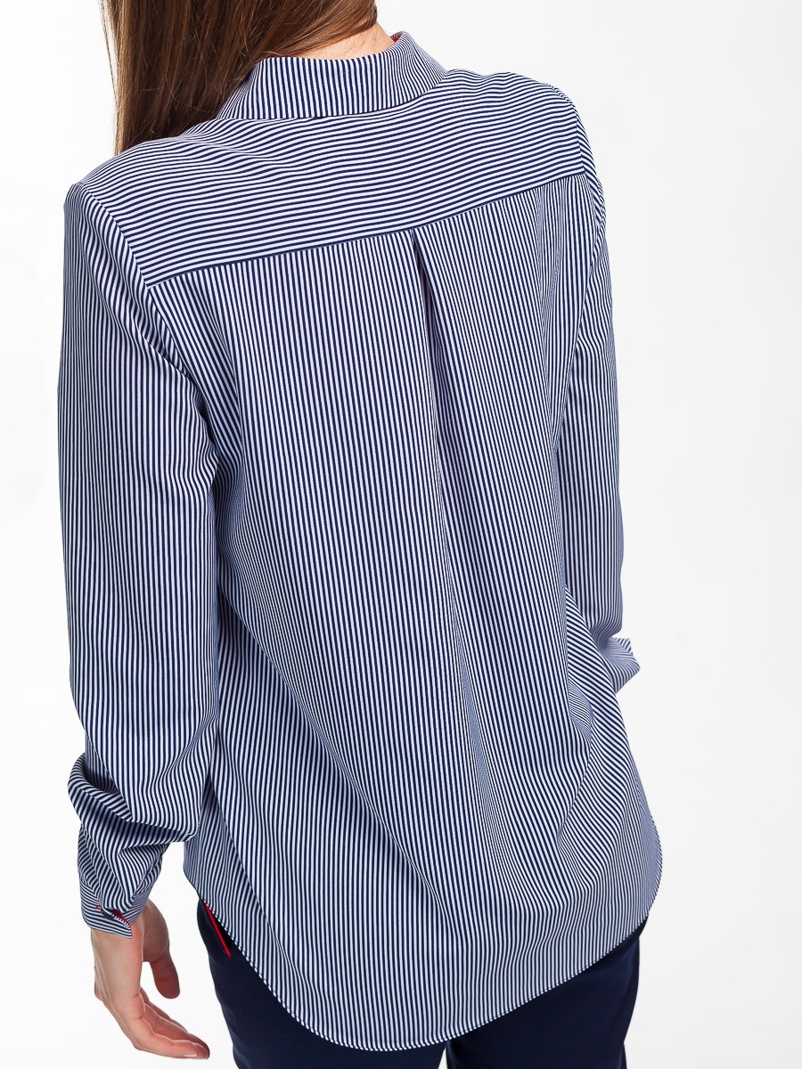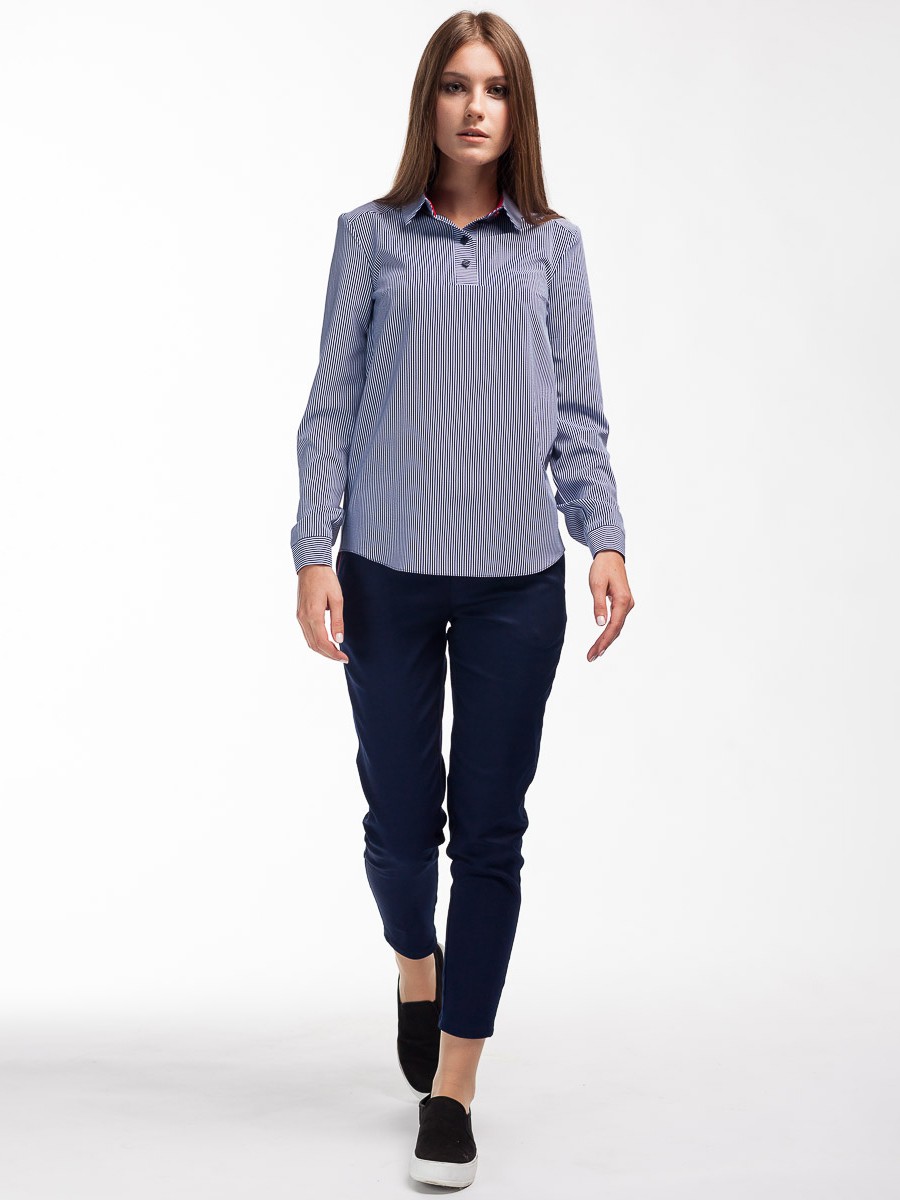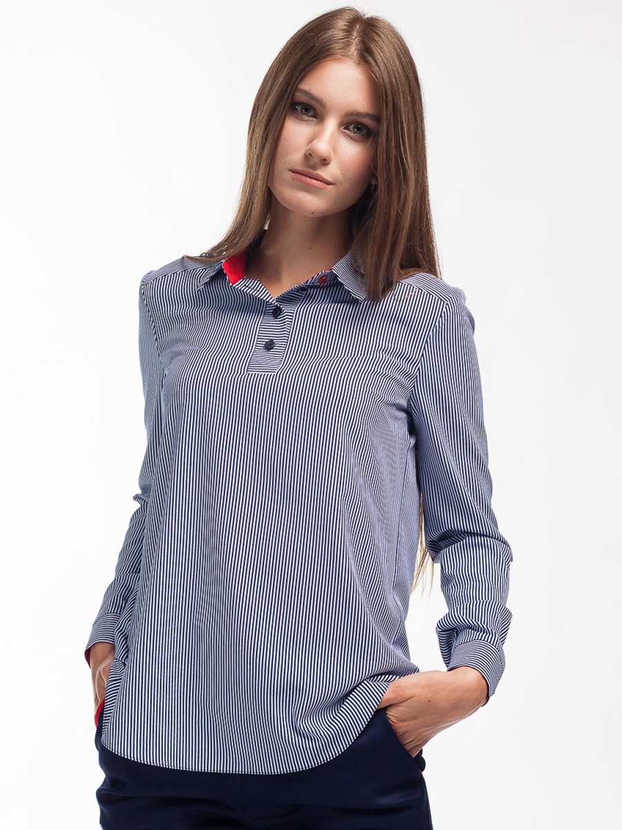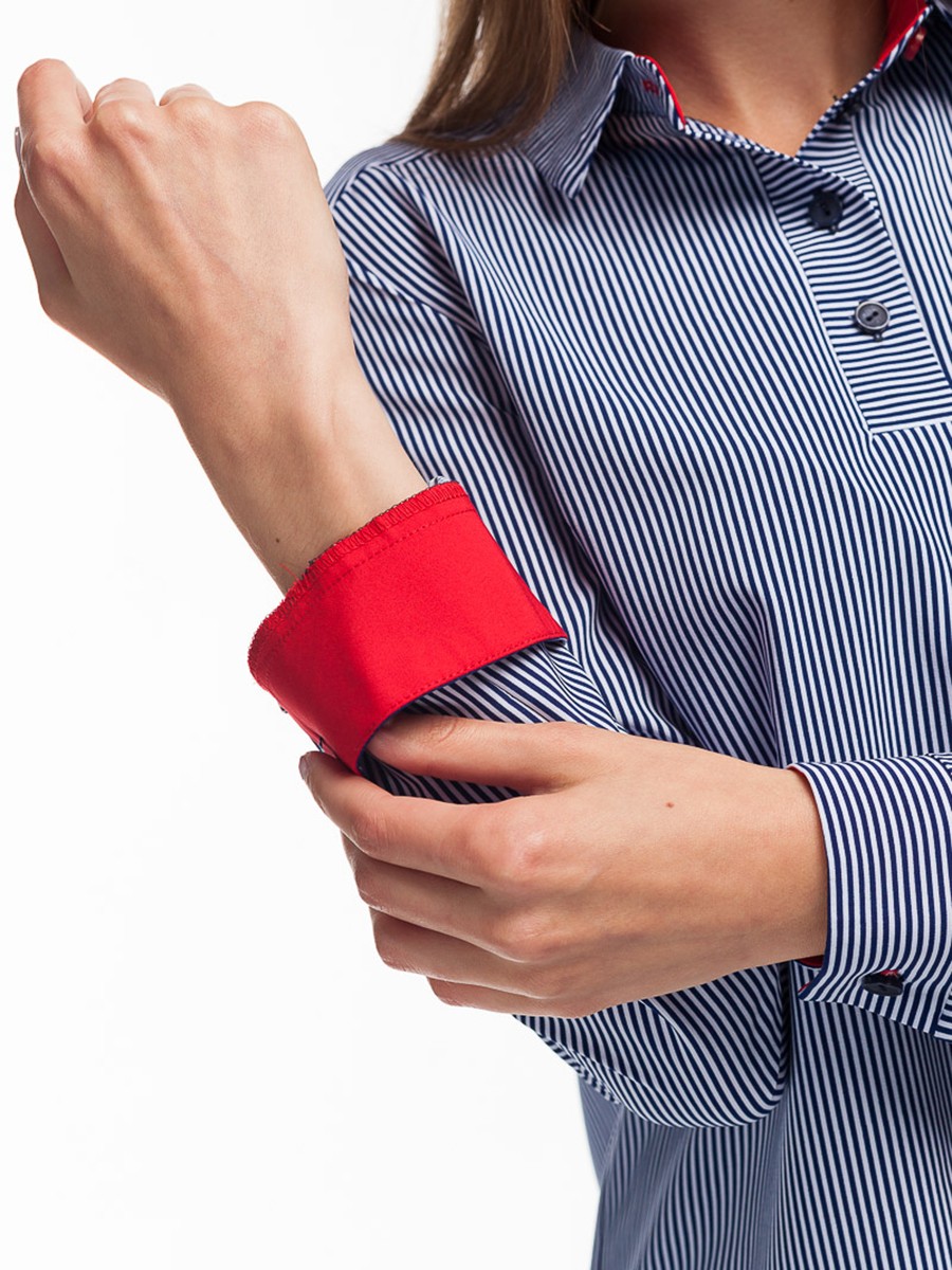 Каждая модница имеет в своем гардеробе хотя бы одну блузку. Блузка необходимая деталь, которая в тоже время и проста, и модна, и многофункциональна. Представляем блузку свободного силуэта с длинным рукавом, стильной красной манжетой и воротником. Мягкая и приятная на ощупь фактура ткани. Глубокий темно синий цвет ткани с принтом полоска. Воротничок с четырьмя пуговицами на передней части. Сзади кокетка со встречной складкой. Низ блузки – плавная волна.