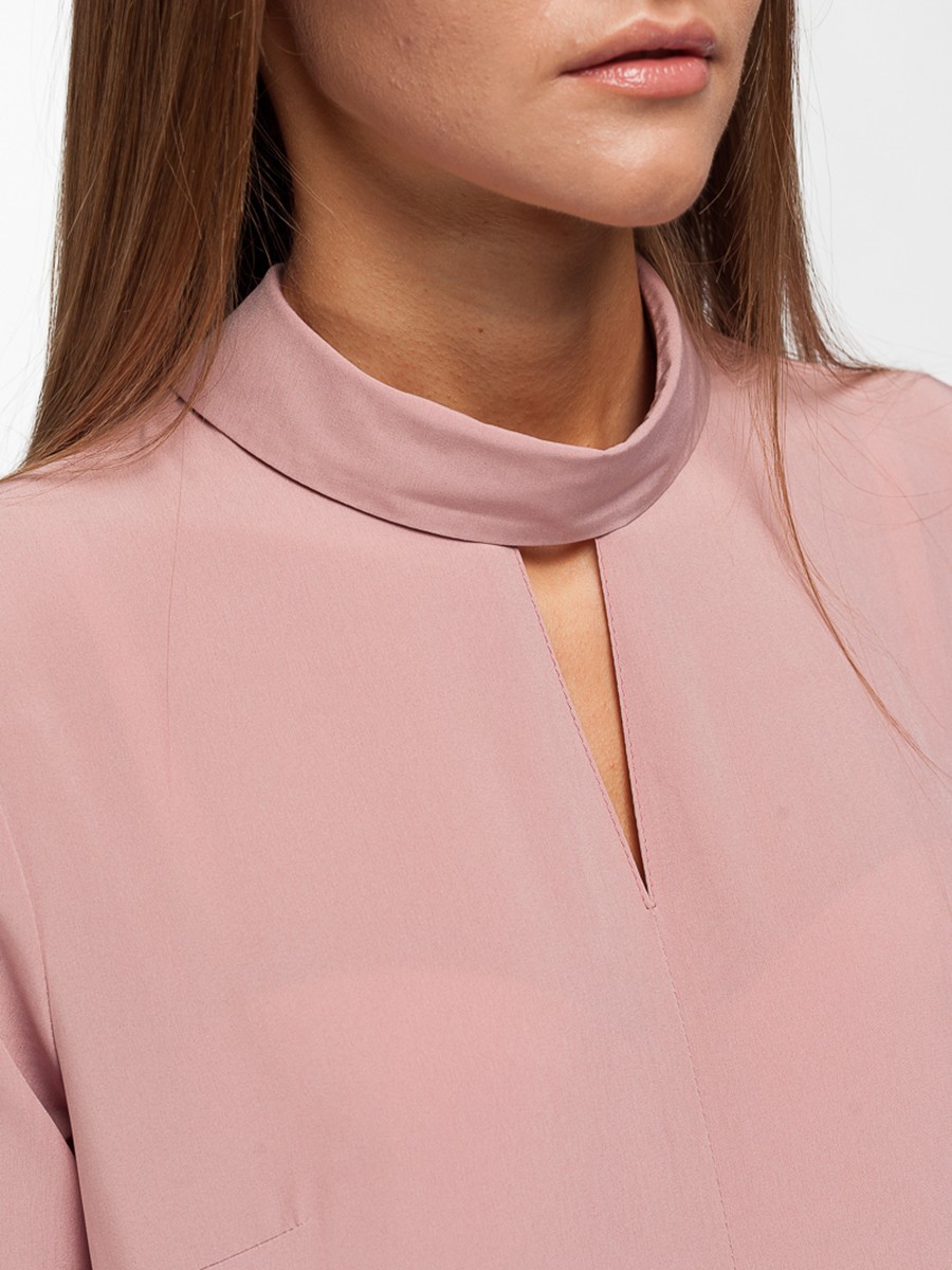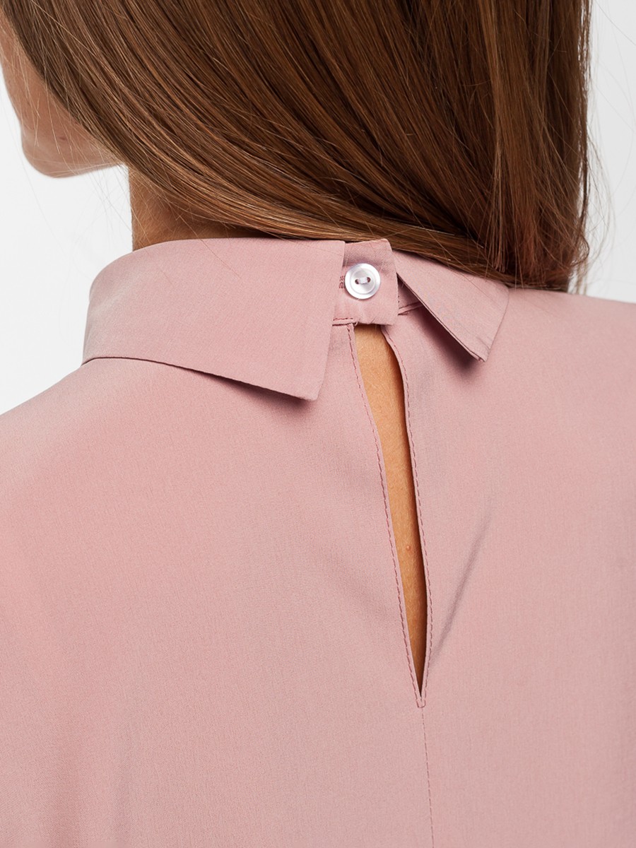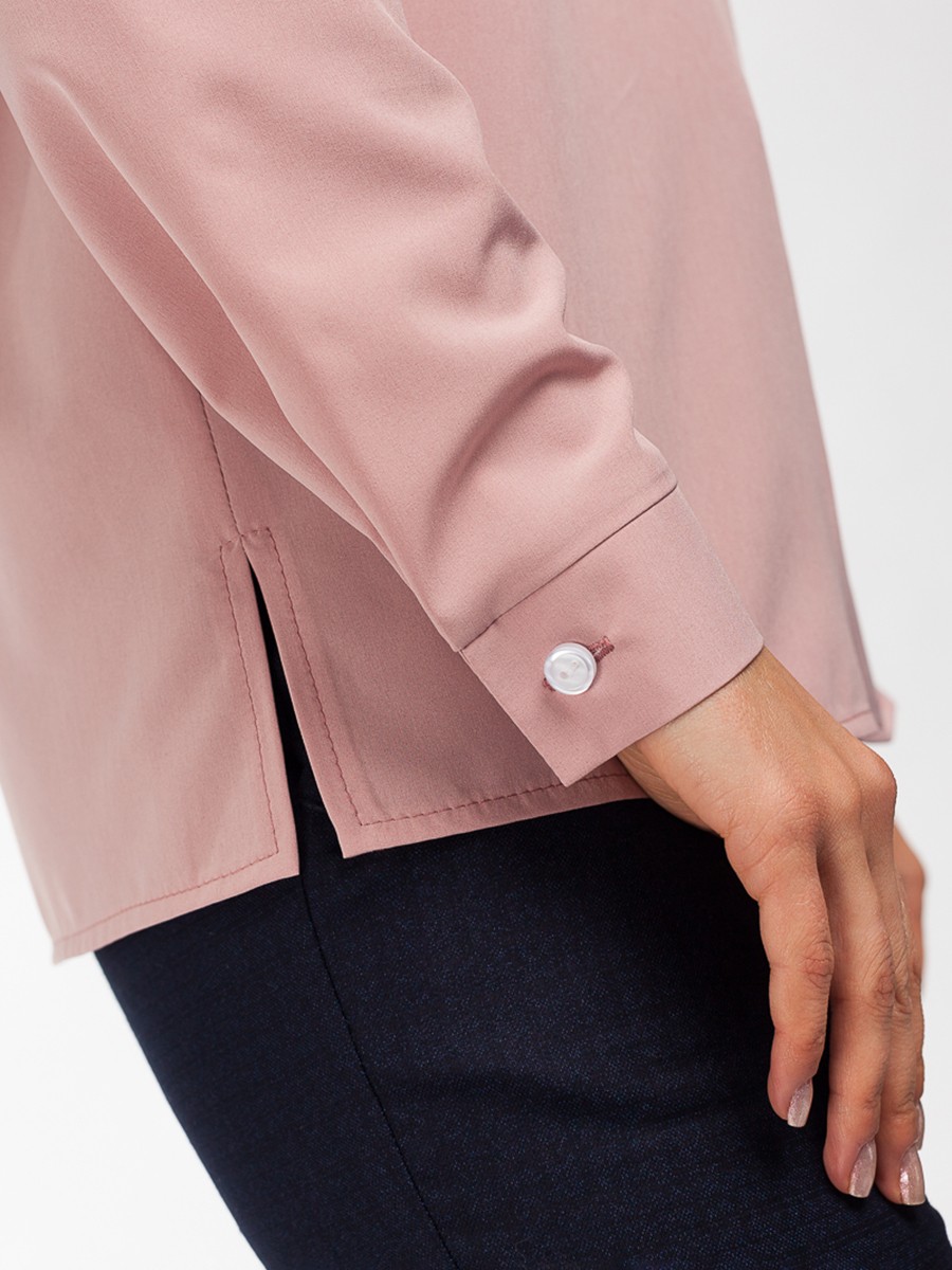 Блузка свободного силуэта с длинным рукавом. Мягкая и приятная на ощупь фактура ткани.  Цвет пудра темная. Горловина – воротник с застежкой сзади. Впереди по воротничку небольшой V-образный разрез. Рукав с манжетой на пуговице. Блуза застегивается сзади на пуговицу. Боковые швы заканчиваются разрезами пять сантиметров.