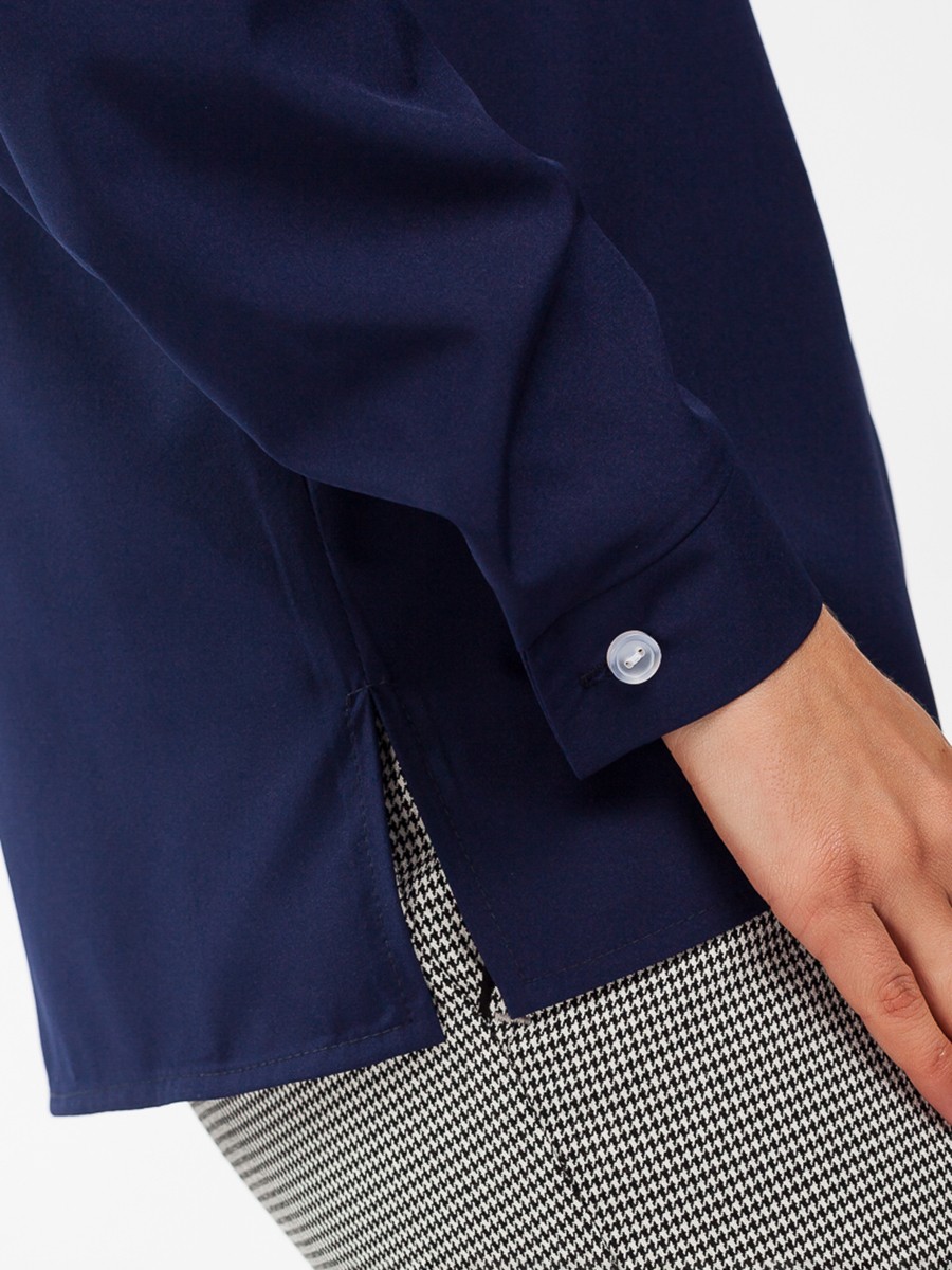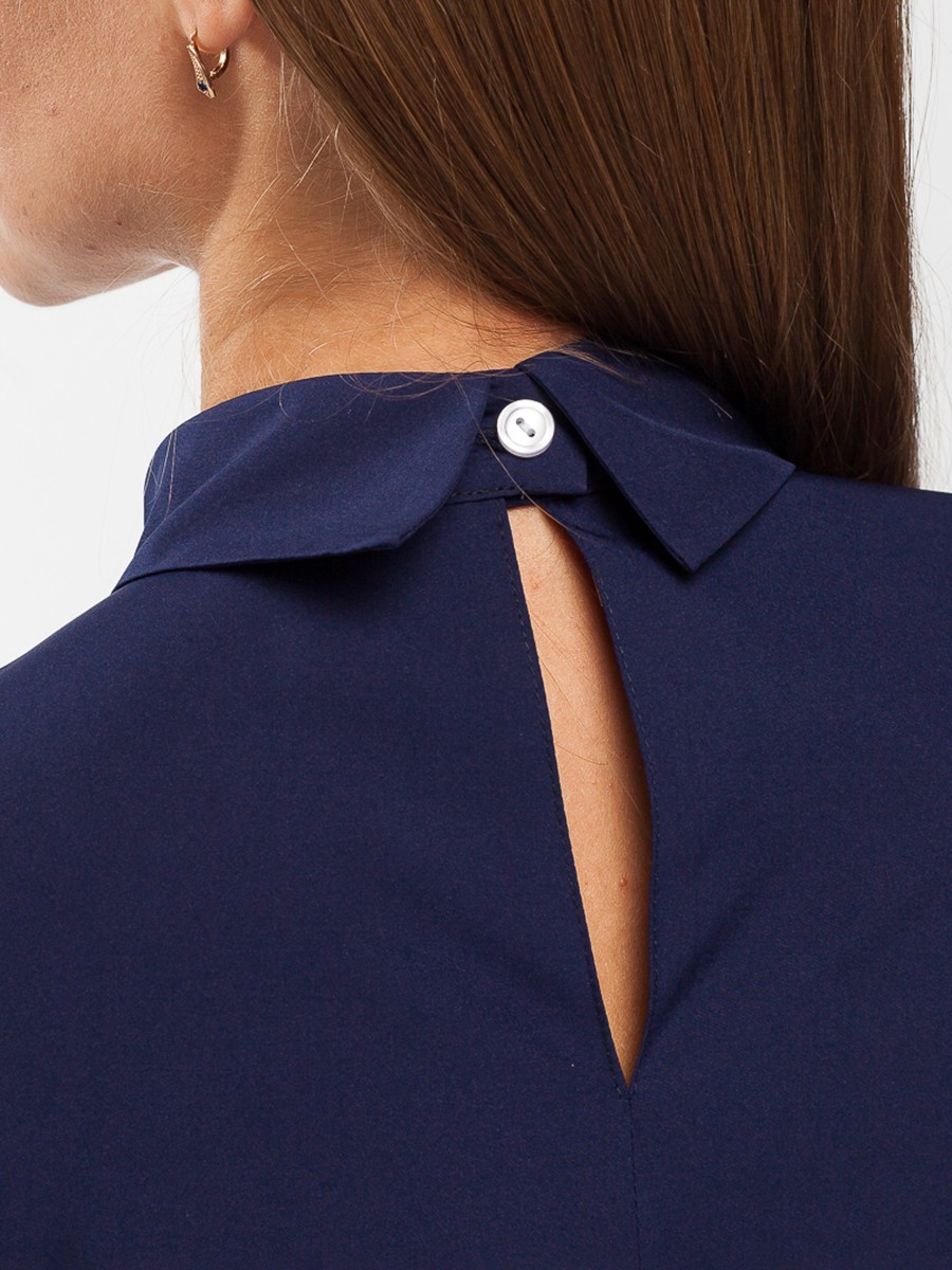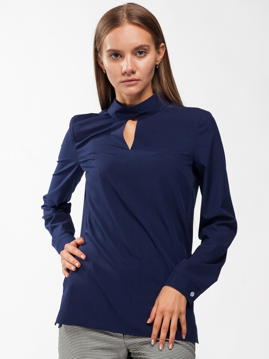 Блузка свободного силуэта с длинным рукавом. Мягкая и приятная на ощупь фактура ткани.  Цвет темно-синий. Горловина – воротник с застежкой сзади. Впереди по воротничку небольшой разрез. Рукав с манжетой на пуговице. Блуза застегивается сзади на пуговицу. Боковые швы заканчиваются разрезами пять сантиметров.