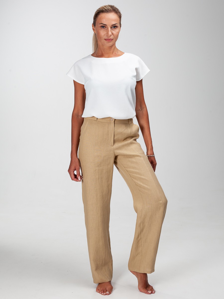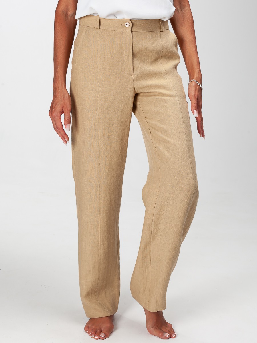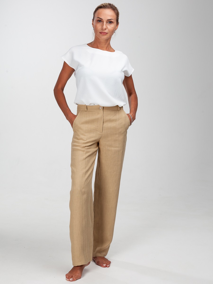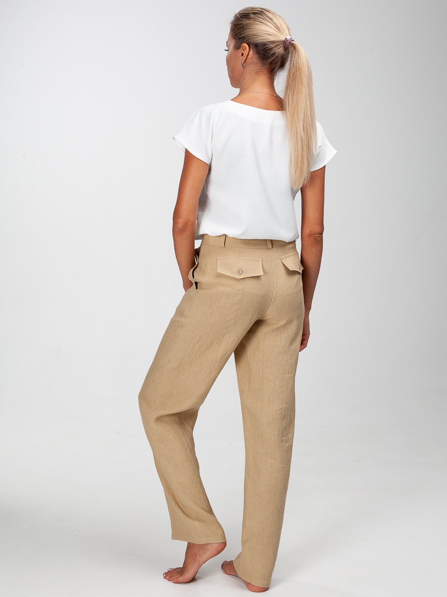 Брюки из 100% льна в светло-бежевом цвете, свободные, для повседневной носки. Передняя и задняя часть штанины отделана декоративной строчкой. На задней части – два клапана с пуговицами. Застежка на молнию, одну обметанную петлю и пуговицу. Предусмотрены глубокие удобные карманы. Прекрасно подойдут для жаркой погоды. Составьте полный образ как на модели с блузкой 305/11/1 и жакетом 607/01/4 от Manika Belle.