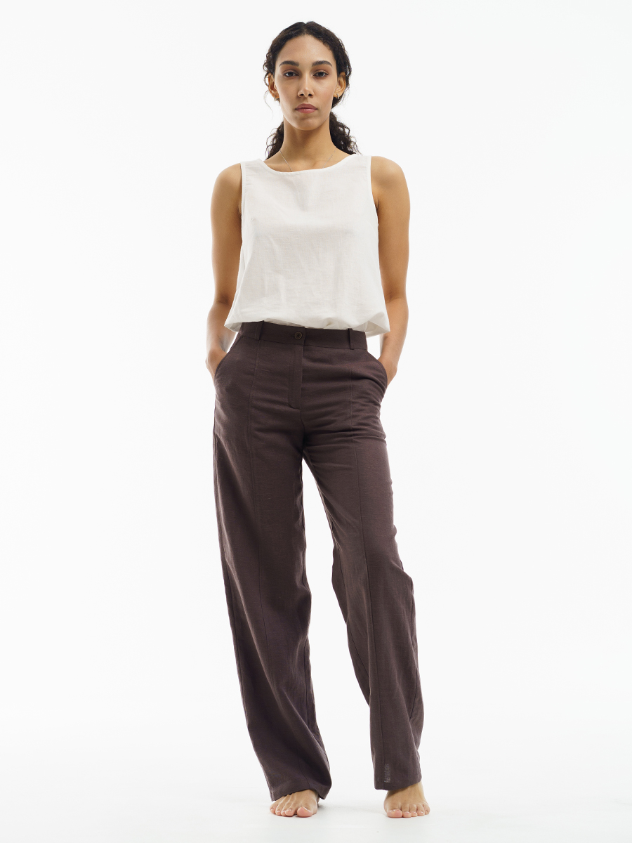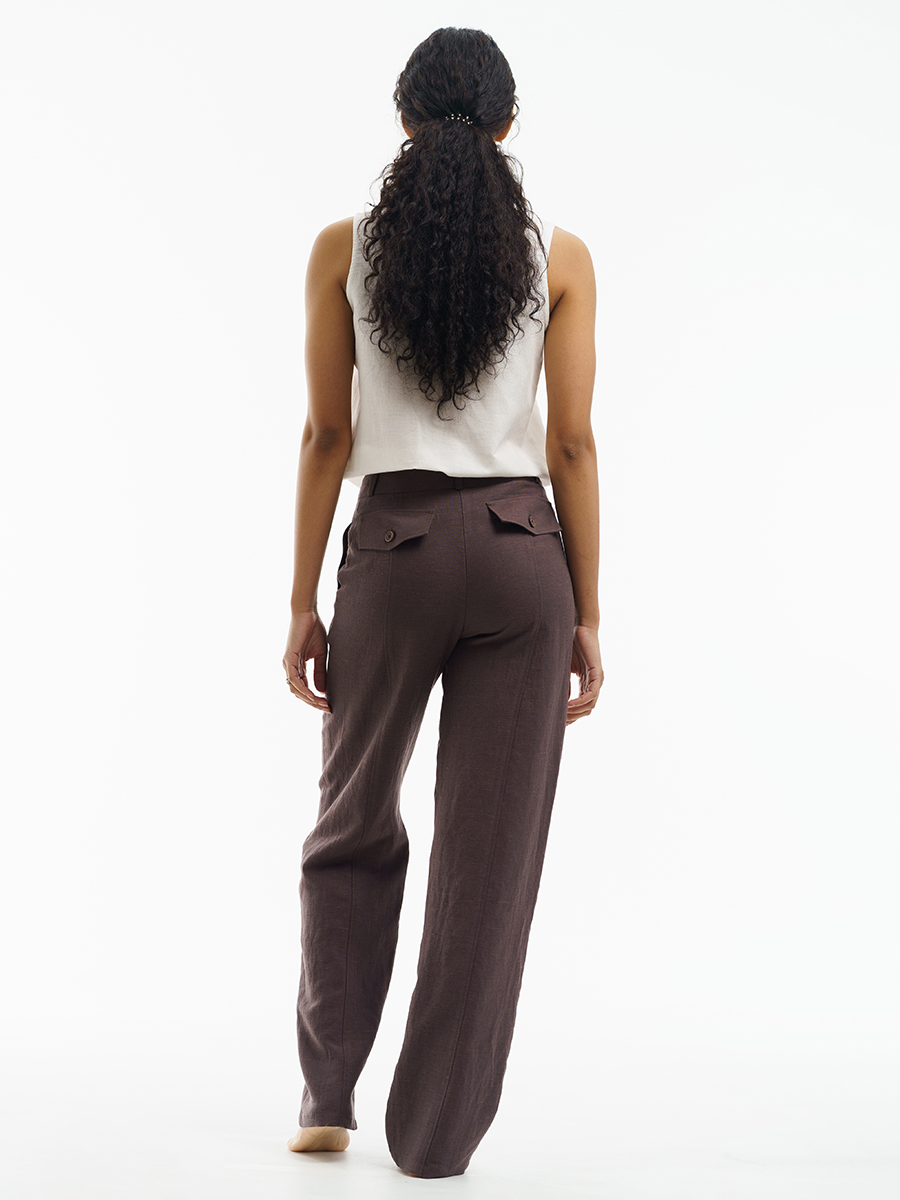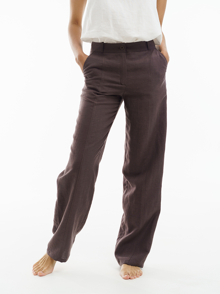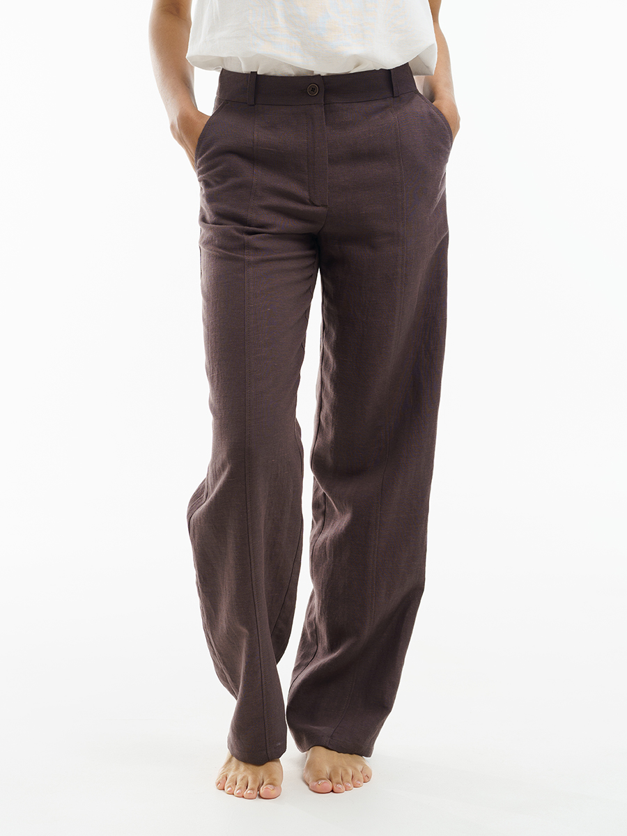 Брюки из льна в шоколадном цвете, свободные, для повседневной носки. Передняя и задняя часть штанины отделана декоративной строчкой. На задней части – два клапана с пуговицами. Застежка на молнию, одну обметанную петлю и пуговицу. Предусмотрены глубокие удобные карманы. Прекрасно подойдут для жаркой погоды. Составьте полный образ как на модели с блузкой 305/11/1 и жакетом 606/01/5 от Manika Belle.