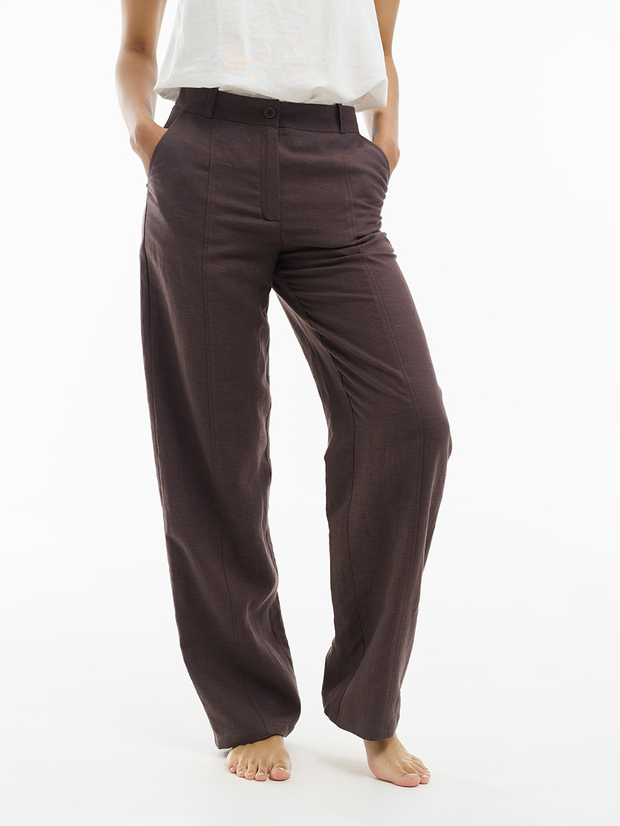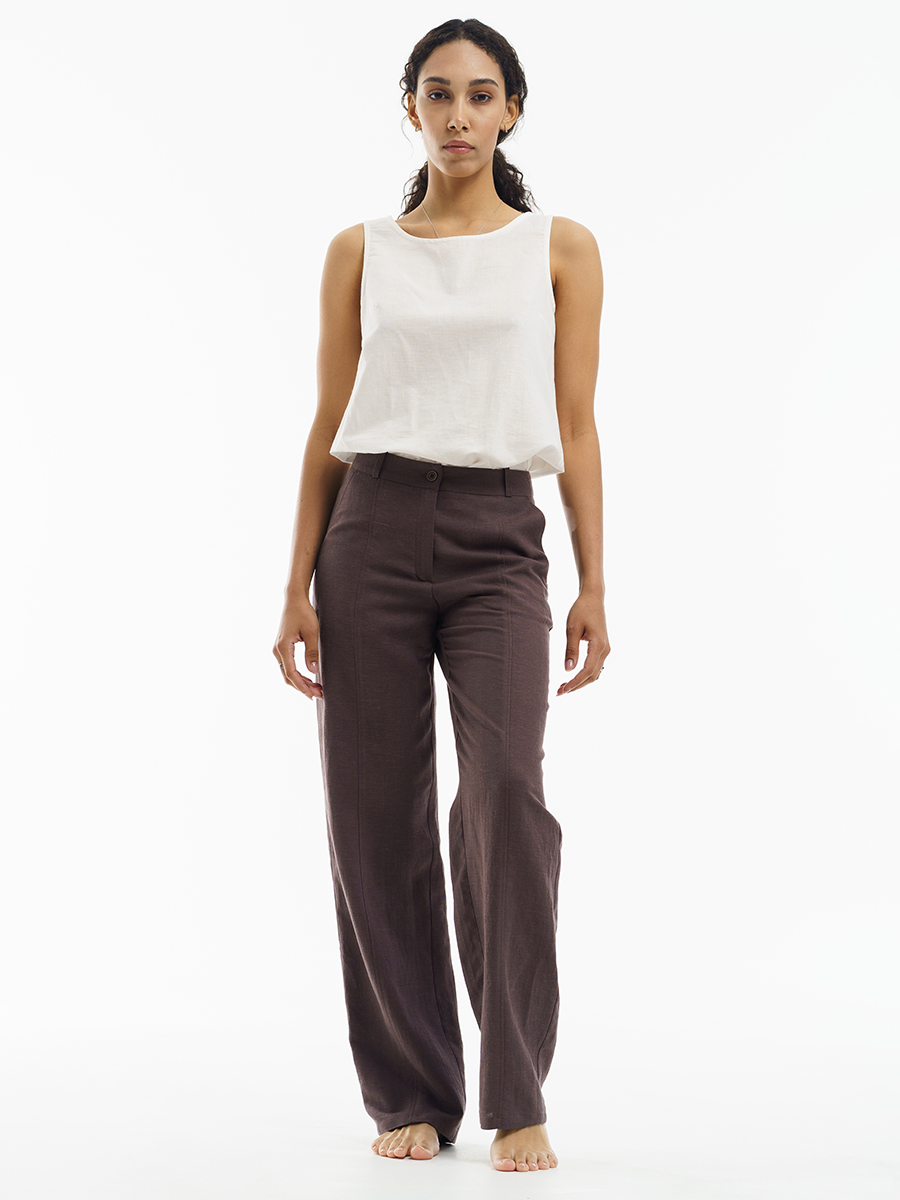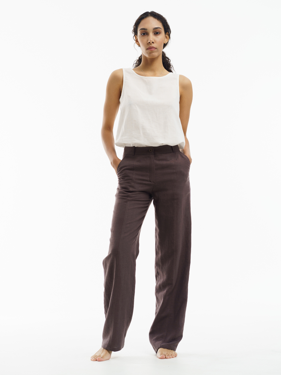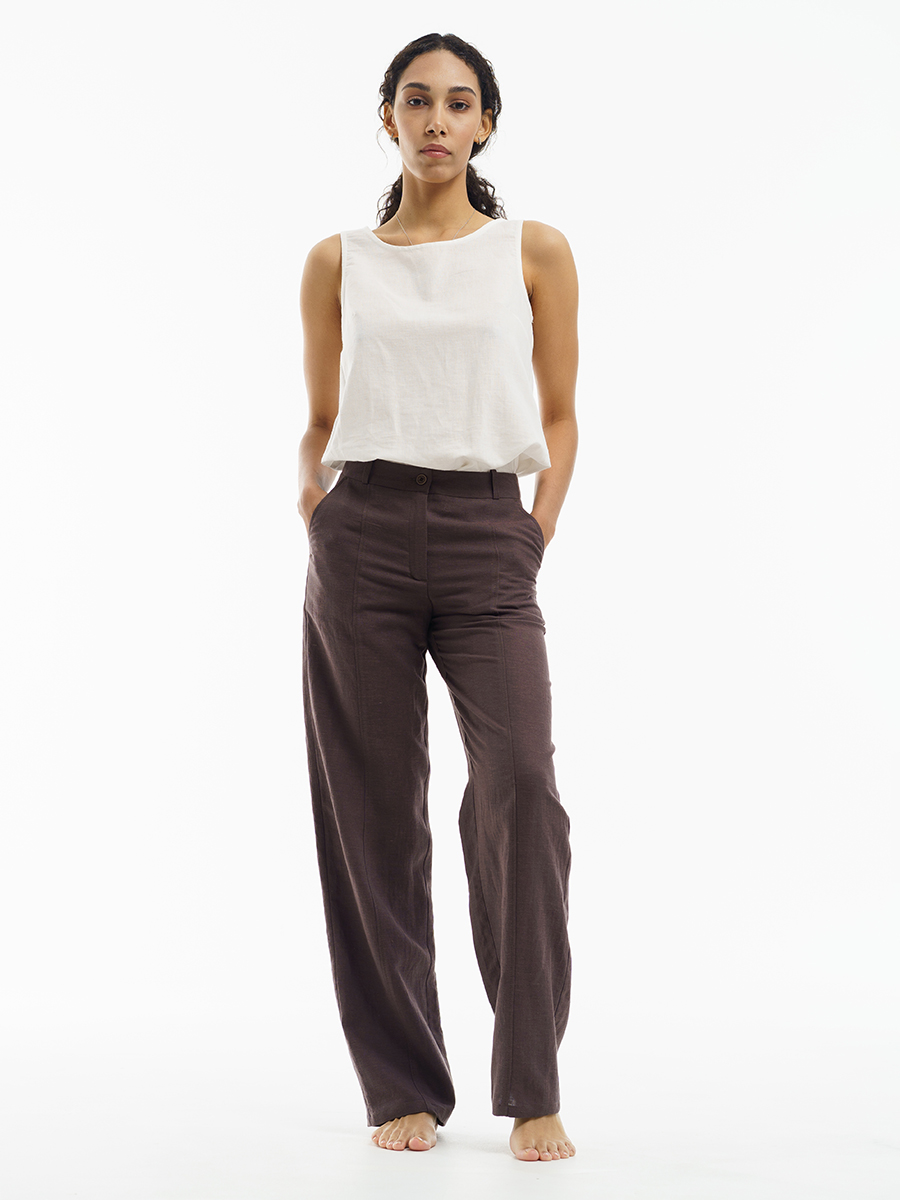 Брюки из льна в шоколадном цвете, свободные, для повседневной носки. Передняя и задняя часть штанины отделана декоративной строчкой. На задней части – два клапана с пуговицами. Застежка на молнию, одну обметанную петлю и пуговицу. Предусмотрены глубокие удобные карманы. Прекрасно подойдут для жаркой погоды. Составьте полный образ как на модели с блузкой 305/11/1 и жакетом 606/01/5 от Manika Belle.