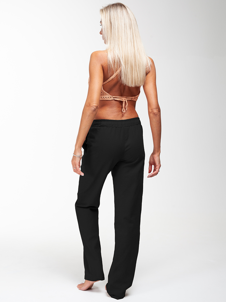 Брюки из 100% льна в черном цвете, свободные, для повседневной носки. Предусмотрены удобные прорезные карманы. В пояс брюк вставлена резинка. Прекрасно подойдут для жаркой погоды и занятий спортом.