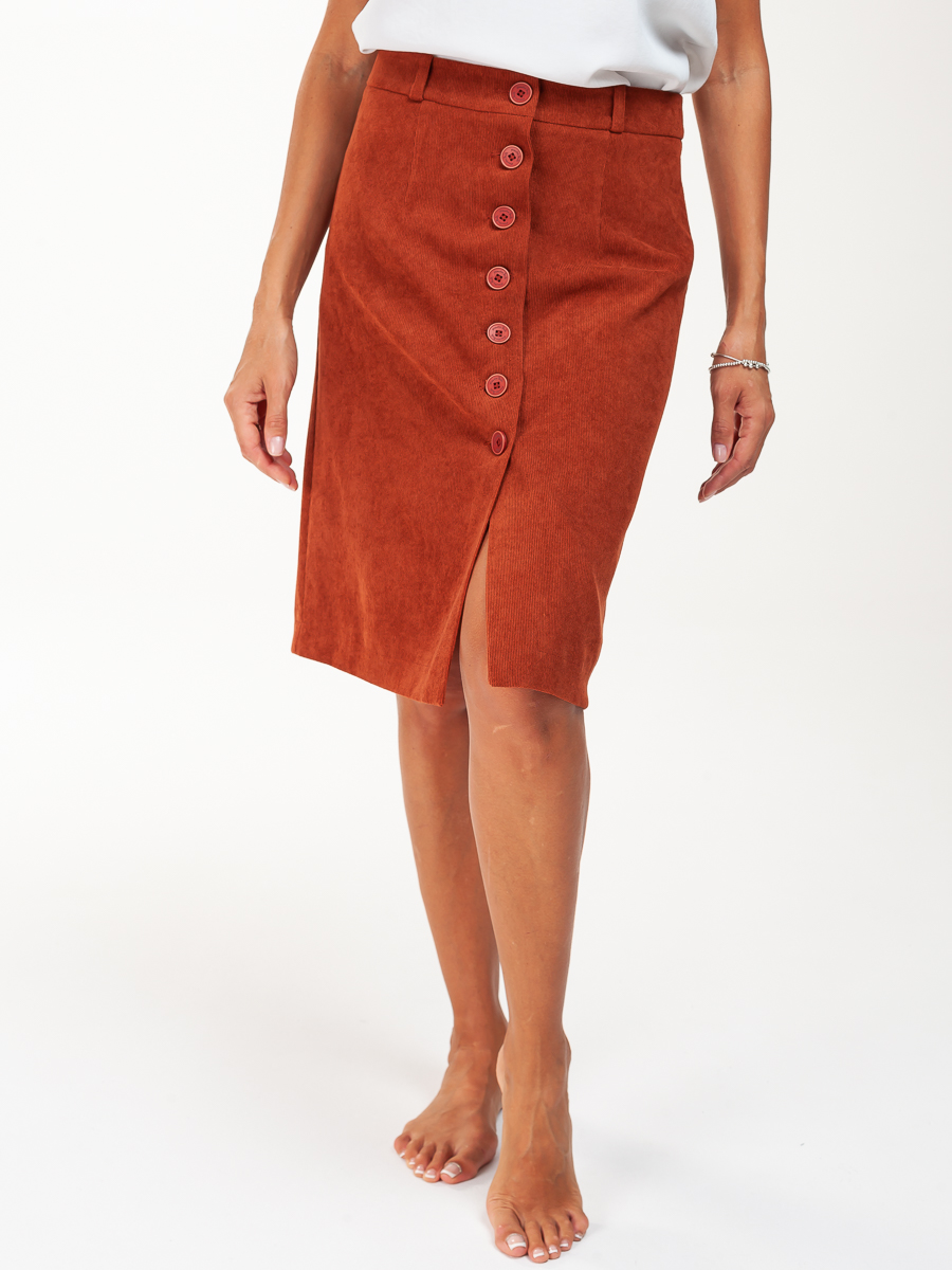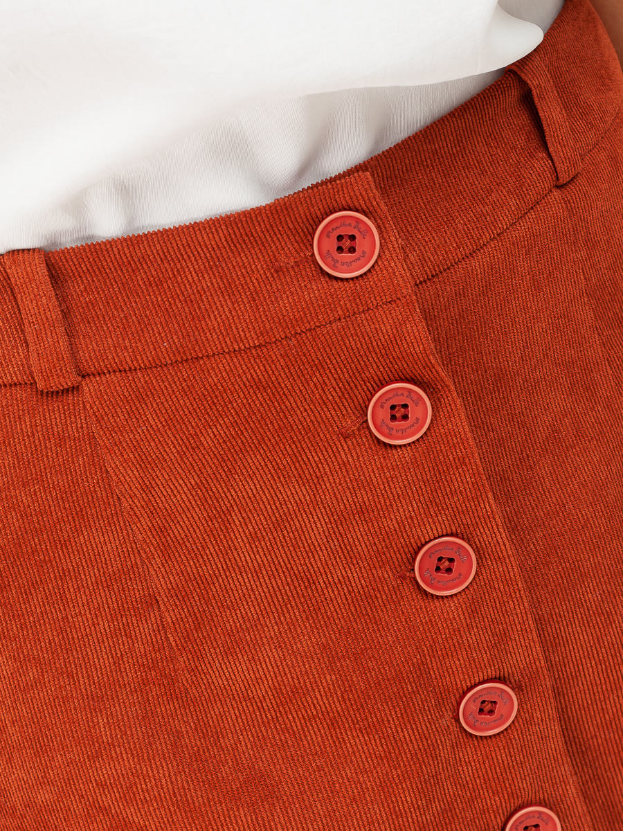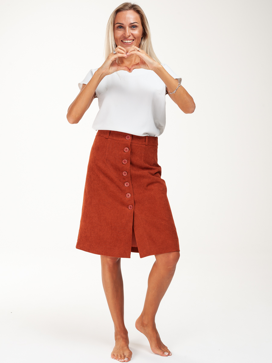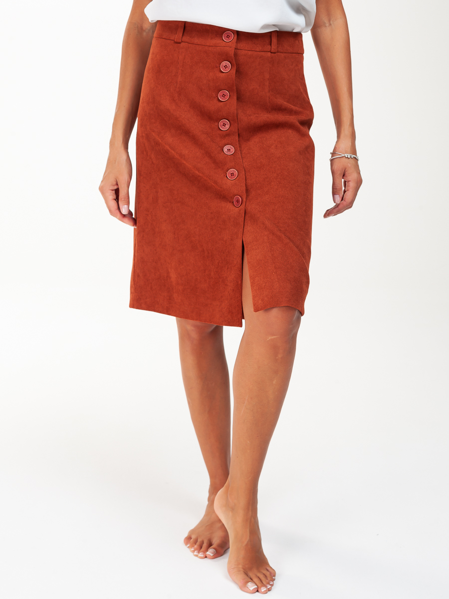 Юбка длинная трапеция из мелкого вельвета для нарядной и повседневной носки. Красивый кирпичный цвет выгодно подчеркнет ваш образ. Силуэта «трапеция», на обтачке. По передней части распашная на пуговицах . На задней части – две вытачки. Юбка с подкладкой в запаковку.