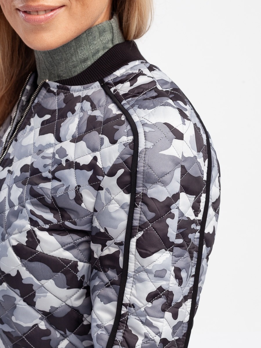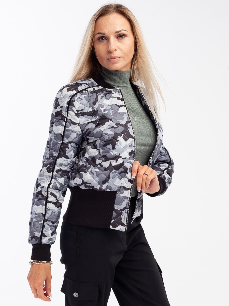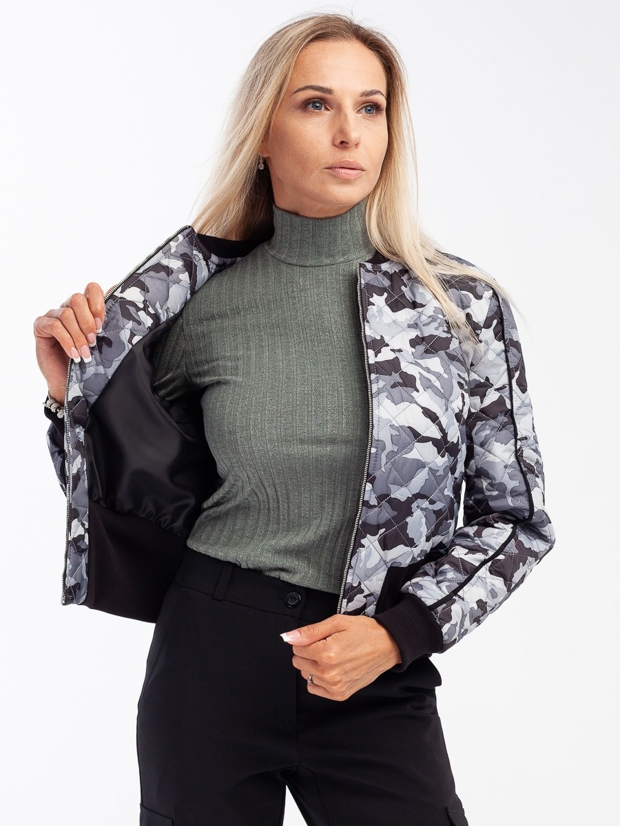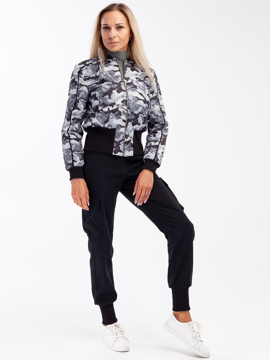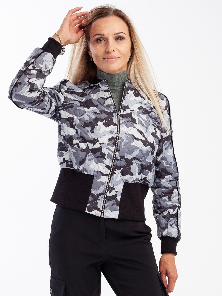 Это короткая куртка свободного силуэта с длинным рукавом. Мягкая и приятная на ощупь фактура ткани. Приятный серо-белый цвет с принтом милитари. Горловина – лодочка. Рукав с манжетой резинкой. Спортивный крой. Куртка застегивается спереди на молнию. Прекрасно сочетаются с брюками карго 410/01/1 от Manika Belle.