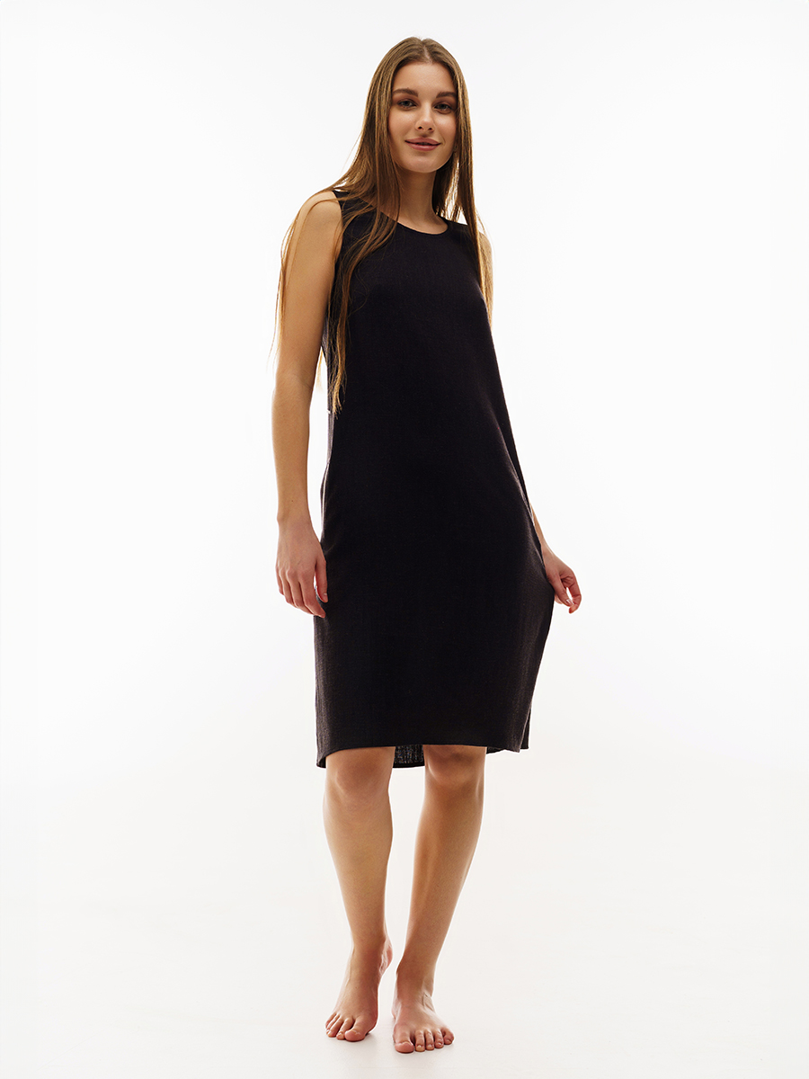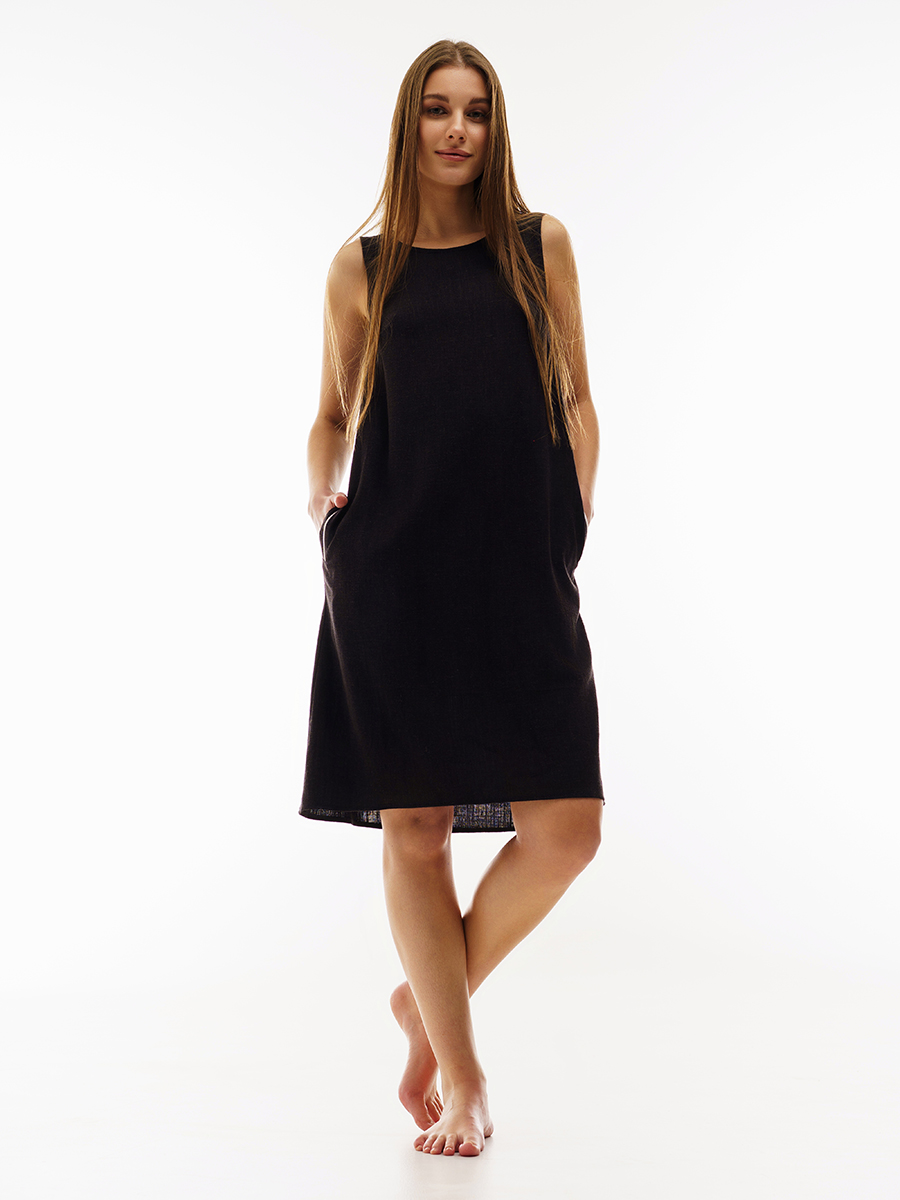 Платье свободное. Свободный силуэт слегка расширенный к низу. Ткань из натуральных волокон, очень приятная на ощупь. На передней части – два кармана с белыми кантами. Сзади в пояснице белый кант. Без рукавов. Платье прекрасно подойдет для жаркого лета.