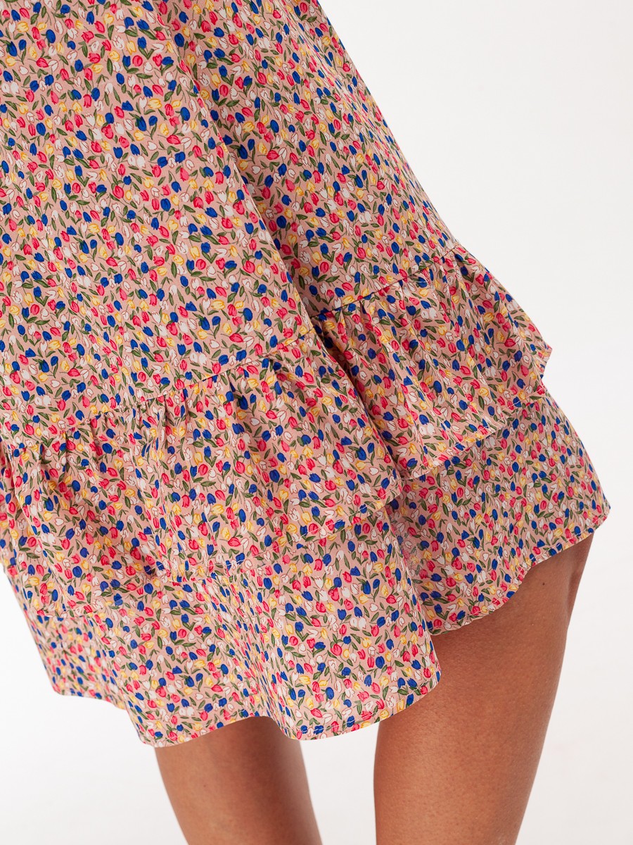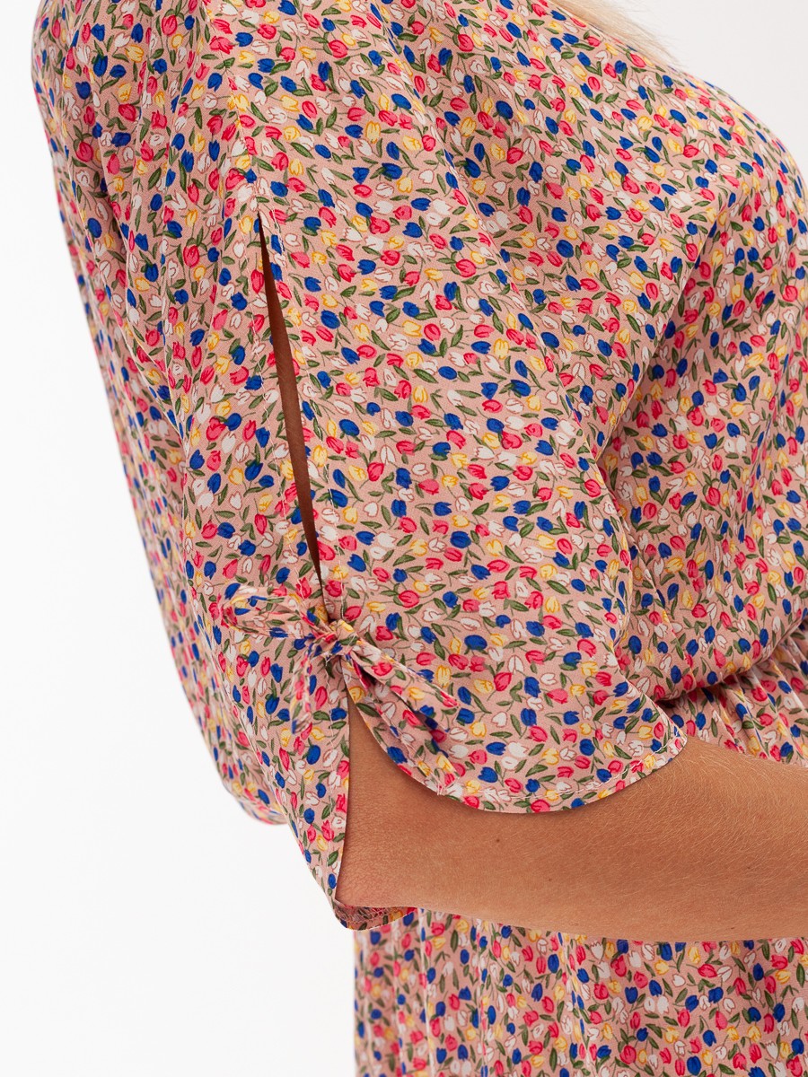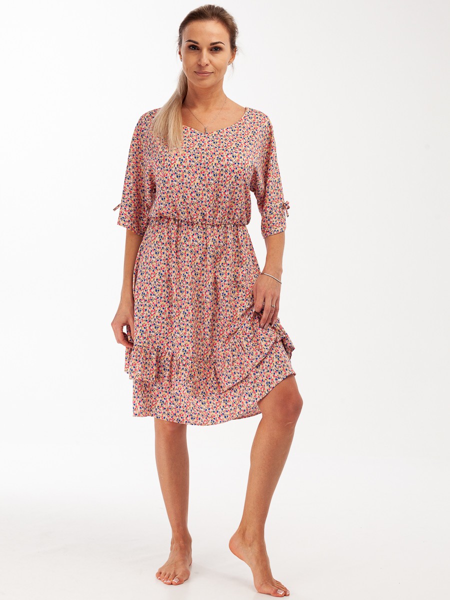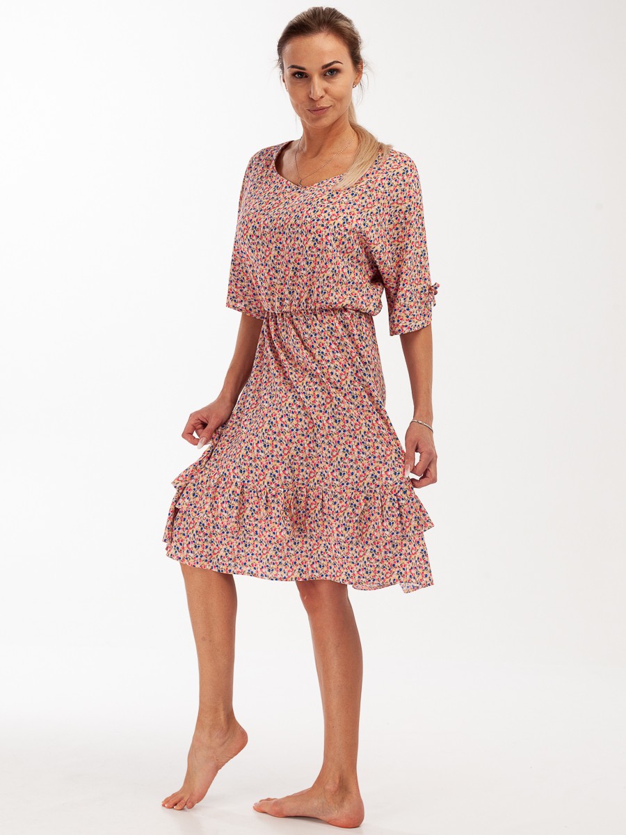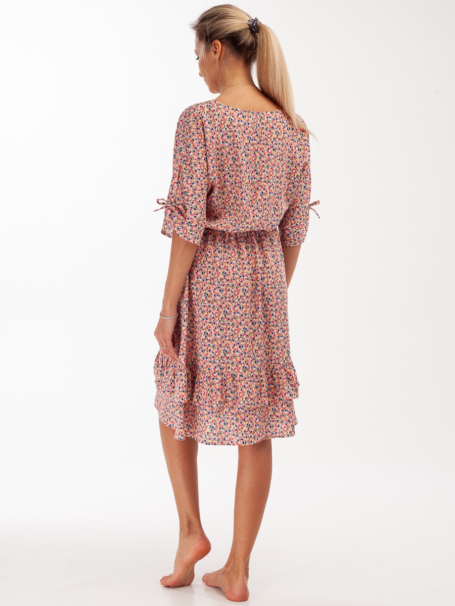 Платье свободного силуэта расширенного к низу. Волан на платье делает его более воздушным.  Ткань из натуральных волокон, очень приятная на ощупь. На поясе – резинка. Рукава 3/4 с разрезами и завязками. Платье без подкладки.
