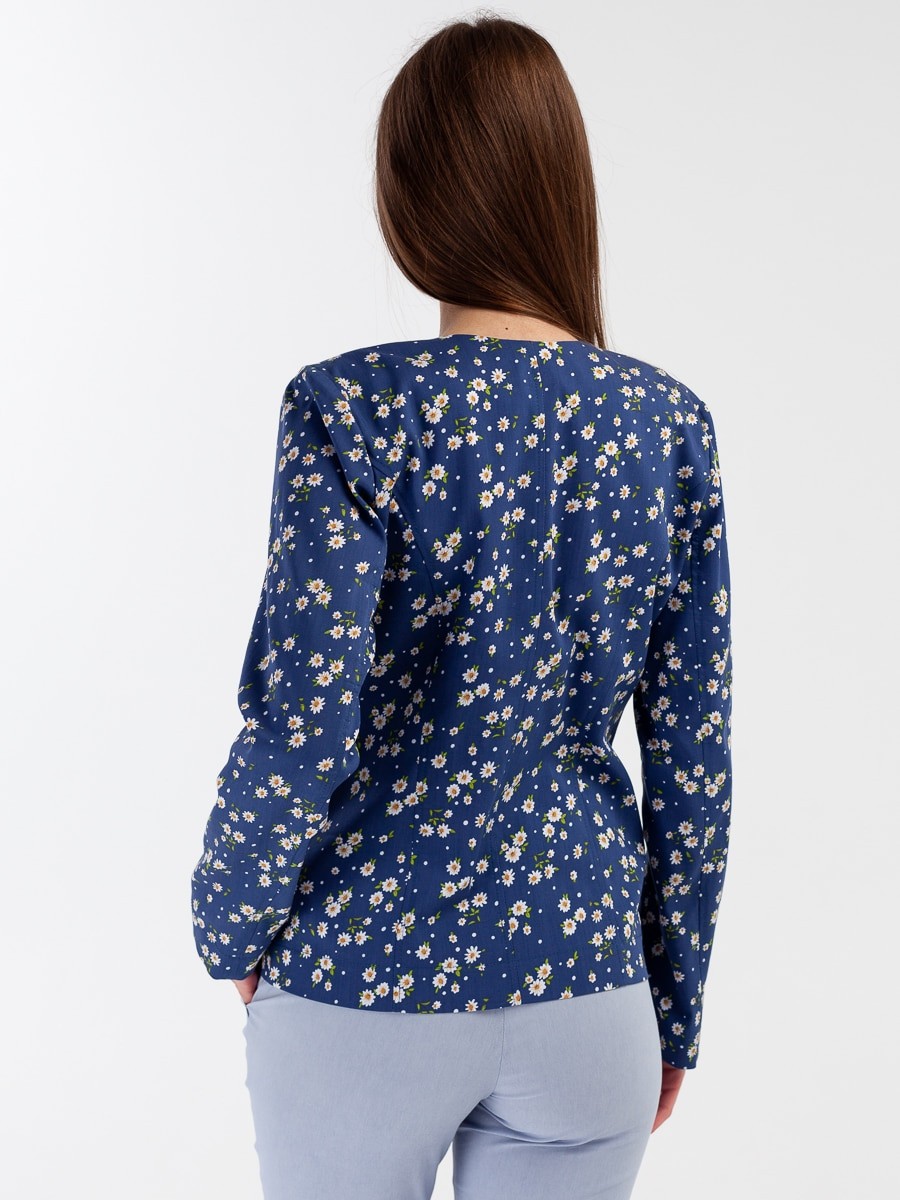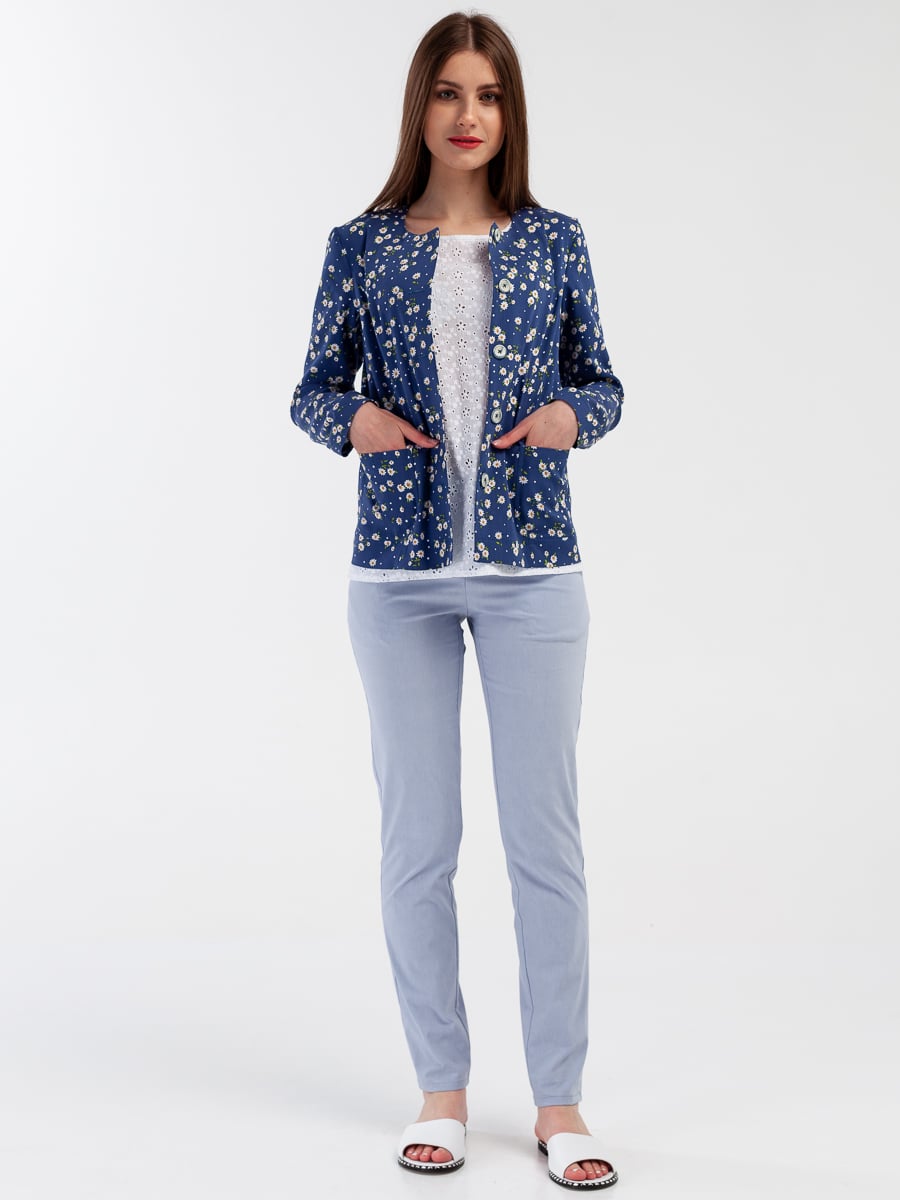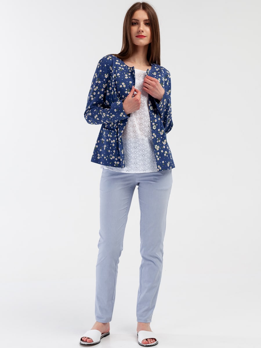 Жакет — элемент базового гардероба, который подстраивается под настроение в образе. Может быть сдержанным и элегантным в сочетании с платьем и классической сумкой на длинном ремне, или можно поймать расслабленное настроение свободных брюк, футболки и поясной сумки, переброшенной через плечо. Завяжите пояс и подчеркните талию, либо придайте образу мягкости, отложив поясок в сторону. Модель выполнена из хлопка. Имеет свободный силуэт и накладные карманы. Мягкая и приятная на ощупь фактура ткани, так как это 100% хлопок. Красивый голубой цвет с принтом из весенних цветов. Овальный вырез горловины. Спереди жакет застегивается на пять пуговиц.