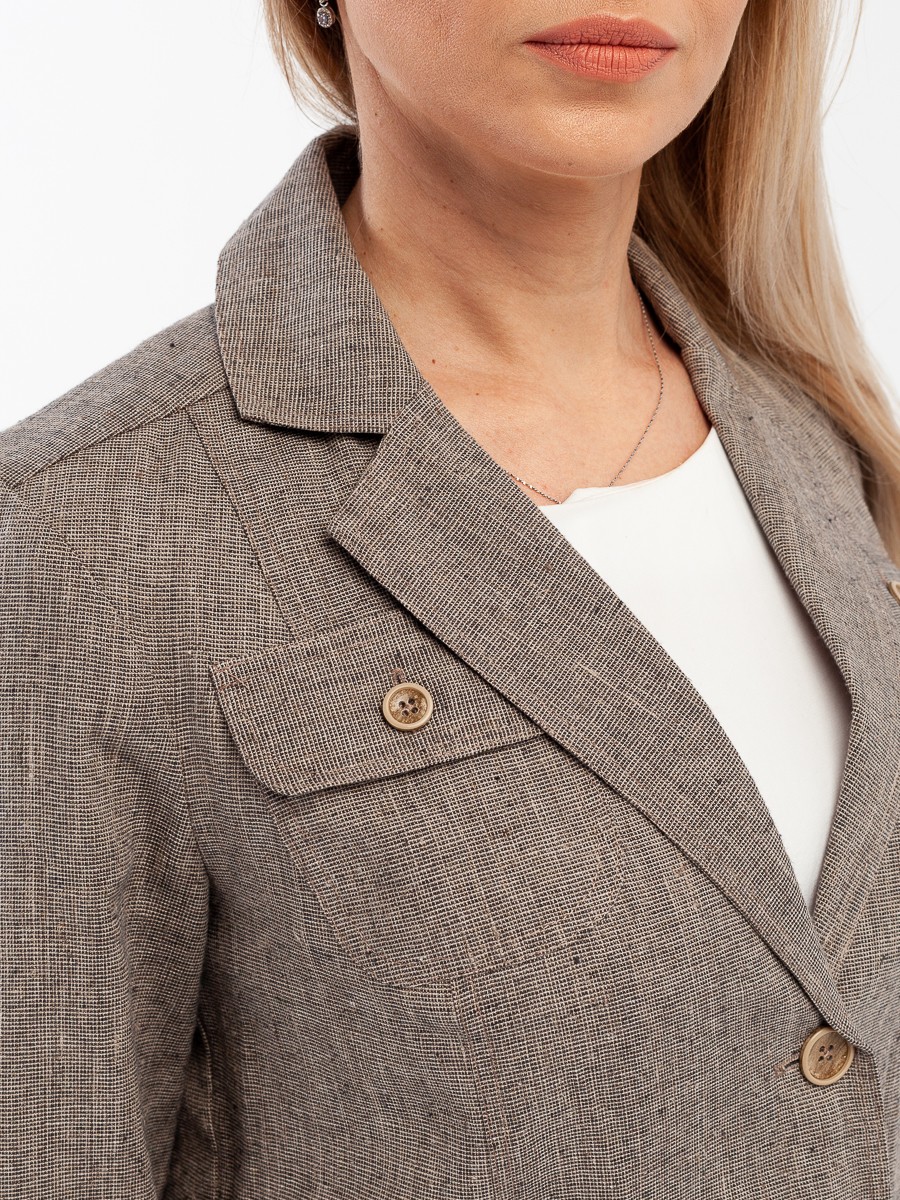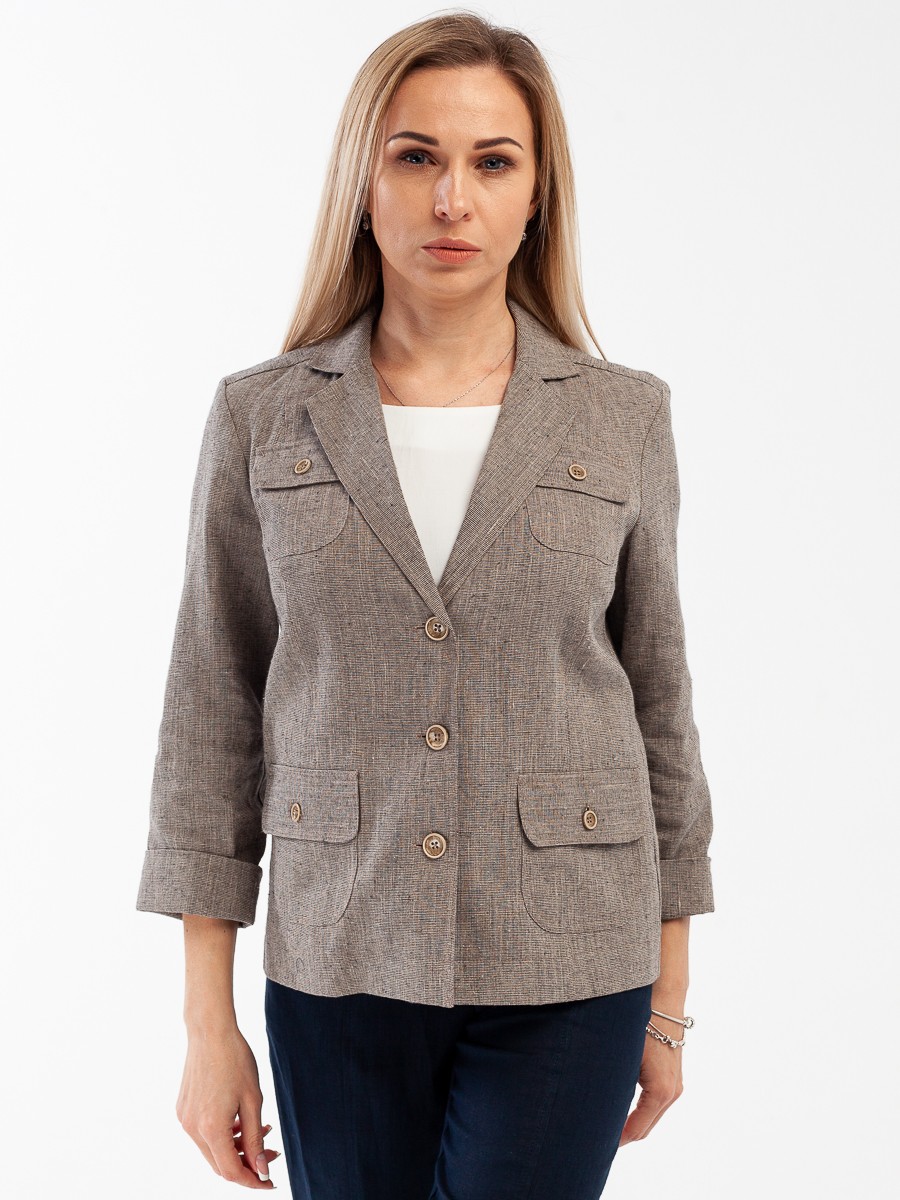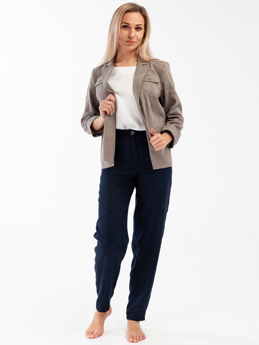 Жакет женский свободного силуэта с длинным рукавом. Рукава можно заложить в манжеты. Мягкая и приятная на ощупь фактура ткани, так как она состоит из 100% льна. Спокойный бежево-серый цвет. Воротник пиджачного типа. Спереди жакет застегивается на три пуговицы. Рукав три четверти с манжетой.  На переде четыре кармана. Представляем вниманию брюки новой коллекции.