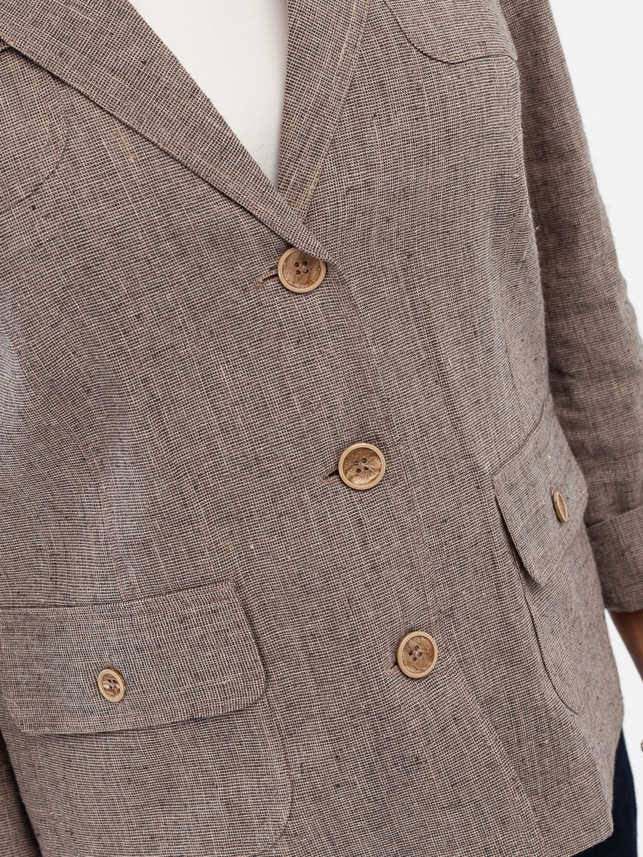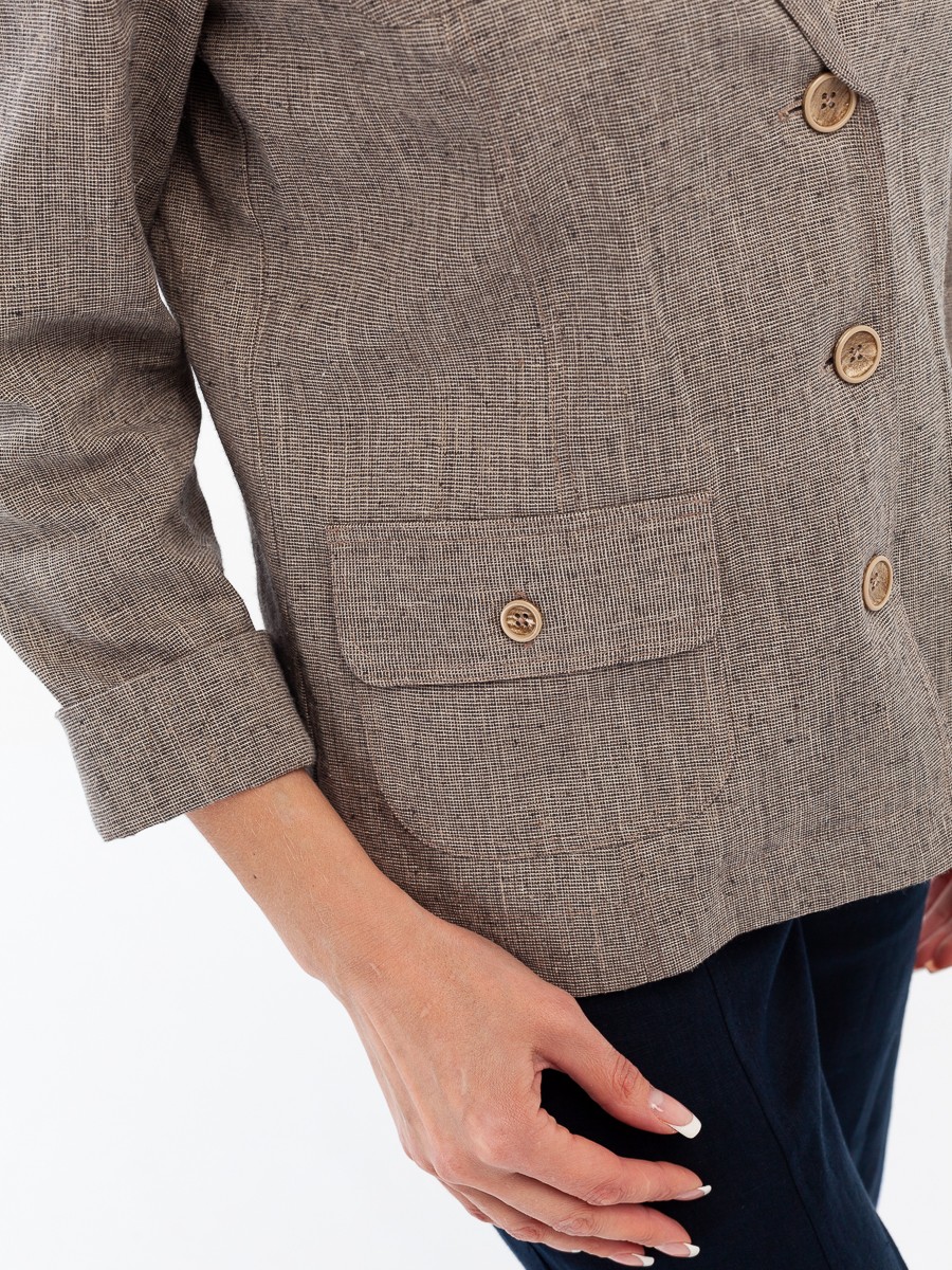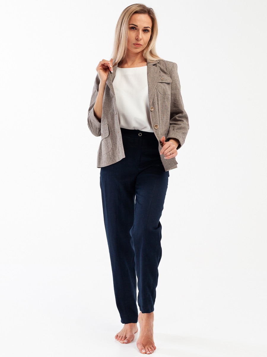 Жакет женский свободного силуэта с длинным рукавом. Рукава можно заложить в манжеты. Мягкая и приятная на ощупь фактура ткани, так как она состоит из 100% льна. Спокойный бежево-серый цвет. Воротник пиджачного типа. Спереди жакет застегивается на три пуговицы. Рукав три четверти с манжетой.  На переде четыре кармана. Представляем вниманию брюки новой коллекции.