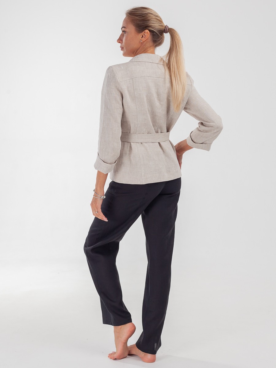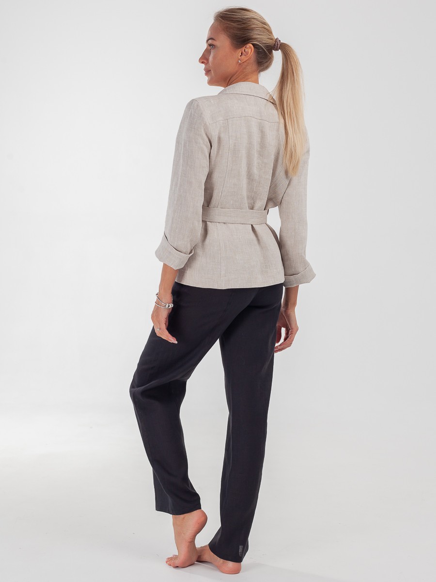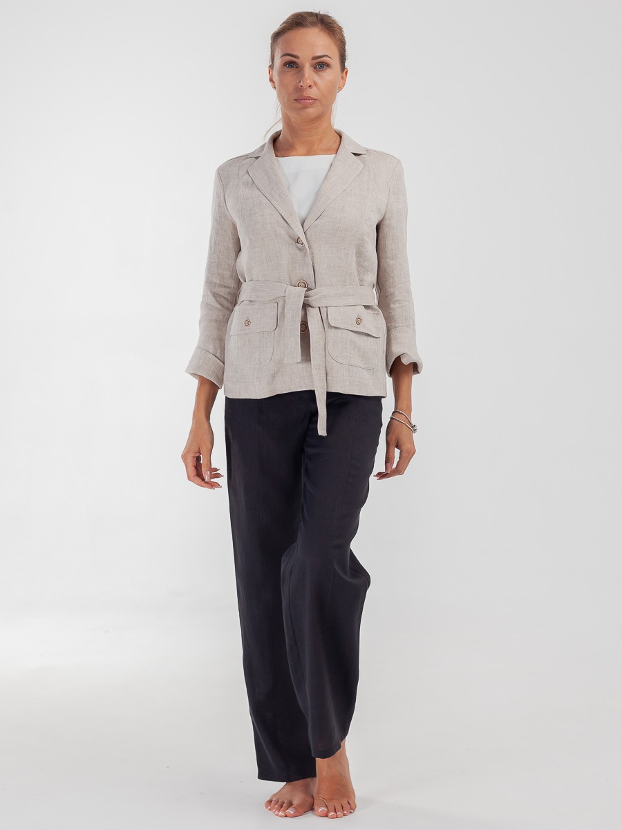 Жакет — элемент базового гардероба, который подстраивается под настроение в образе. Может быть сдержанным и элегантным в сочетании с платьем и классической сумкой на длинном ремне, или можно поймать расслабленное настроение свободных брюк, футболки и поясной сумки, переброшенной через плечо. Завяжите пояс и подчеркните талию, либо придайте образу мягкости, отложив поясок в сторону. Модель выполнена из льна. Имеет свободный силуэт и накладные карманы. Рукава можно заложить в манжеты. Мягкая и приятная на ощупь фактура ткани, так как это 100% лен. Спокойный бежевый цвет. Воротник пиджачного типа. Спереди жакет застегивается на три пуговицы.