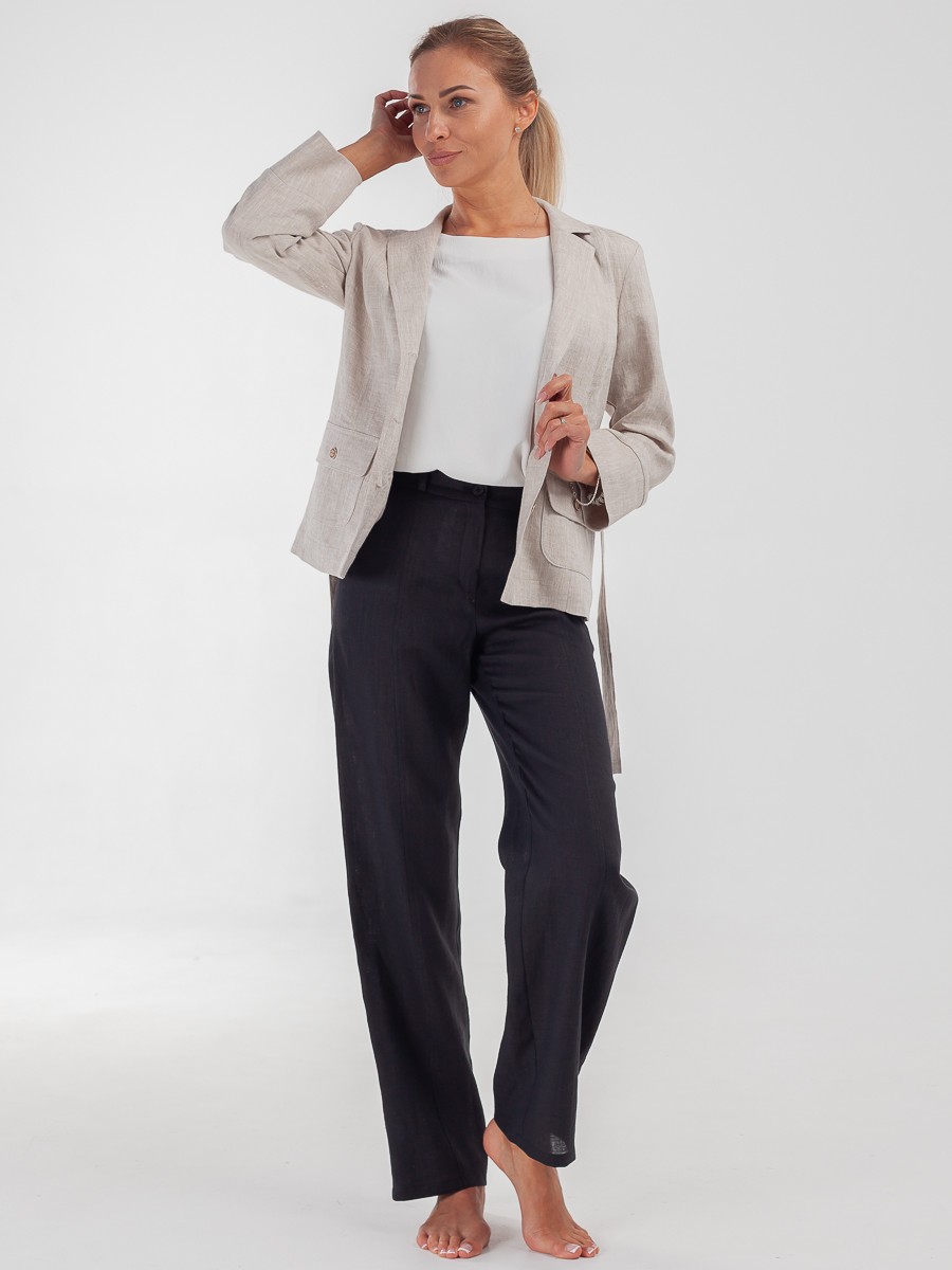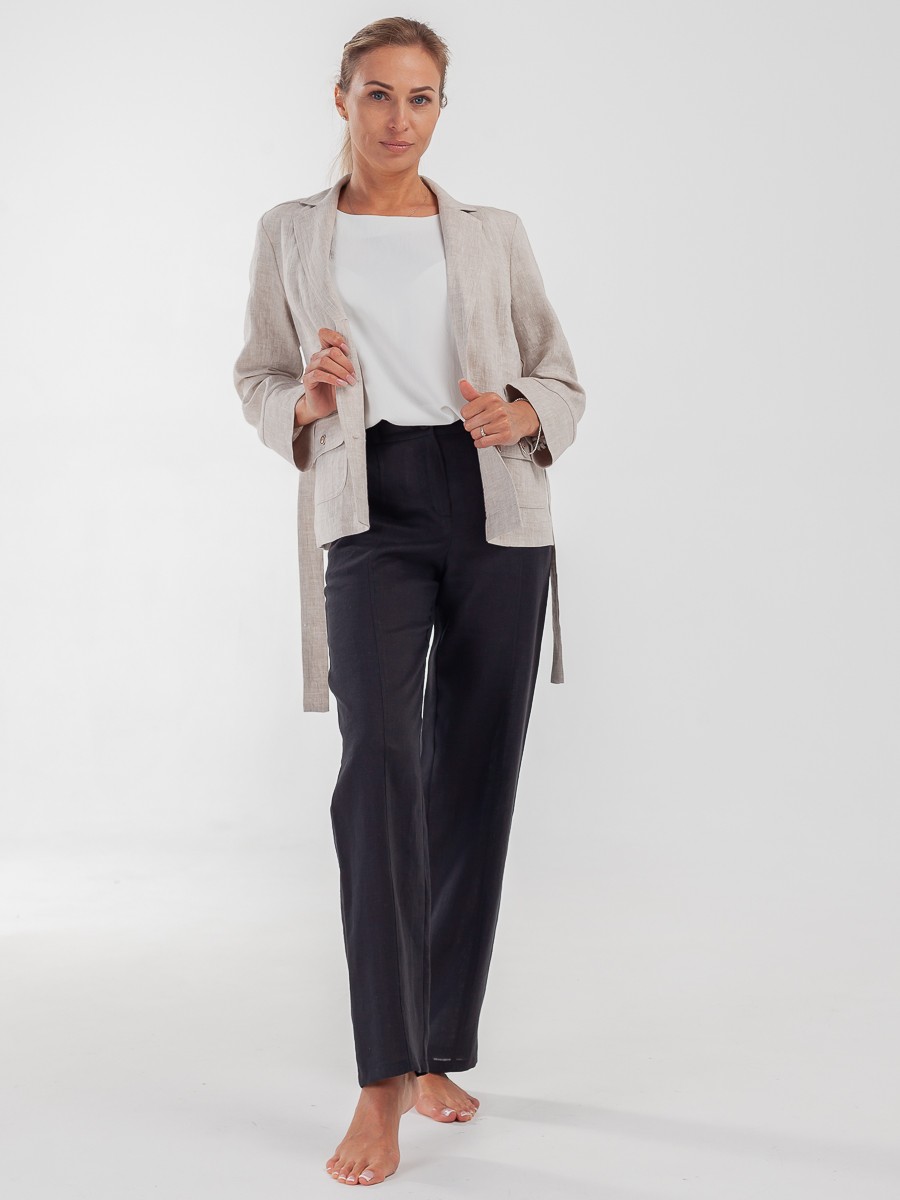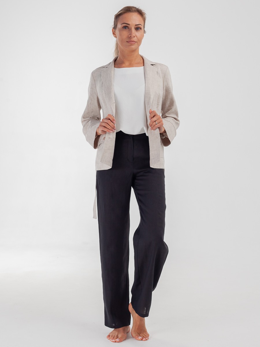 Жакет — элемент базового гардероба, который подстраивается под настроение в образе. Может быть сдержанным и элегантным в сочетании с платьем и классической сумкой на длинном ремне, или можно поймать расслабленное настроение свободных брюк, футболки и поясной сумки, переброшенной через плечо. Завяжите пояс и подчеркните талию, либо придайте образу мягкости, отложив поясок в сторону. Модель выполнена из льна. Имеет свободный силуэт и накладные карманы. Рукава можно заложить в манжеты. Мягкая и приятная на ощупь фактура ткани, так как это 100% лен. Спокойный бежевый цвет. Воротник пиджачного типа. Спереди жакет застегивается на три пуговицы.
